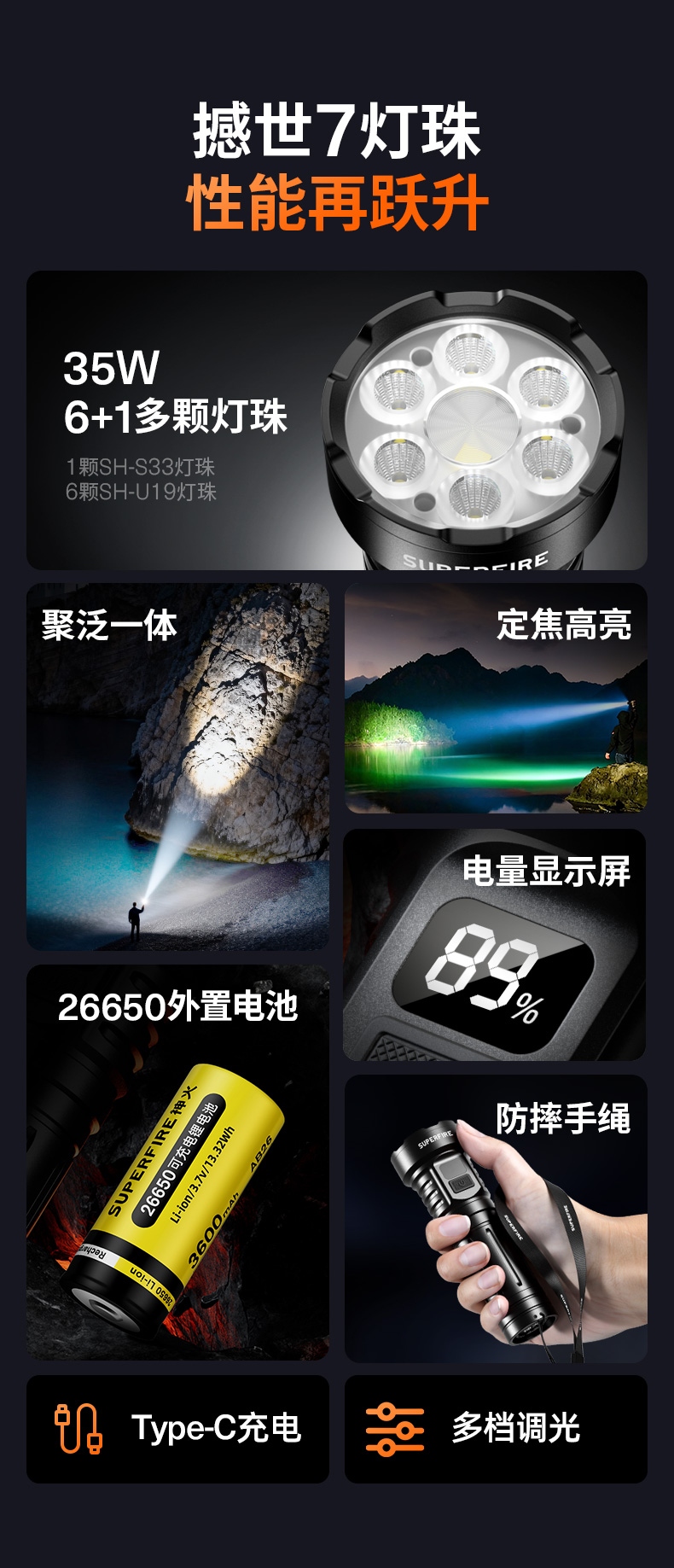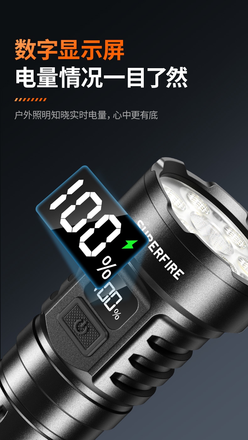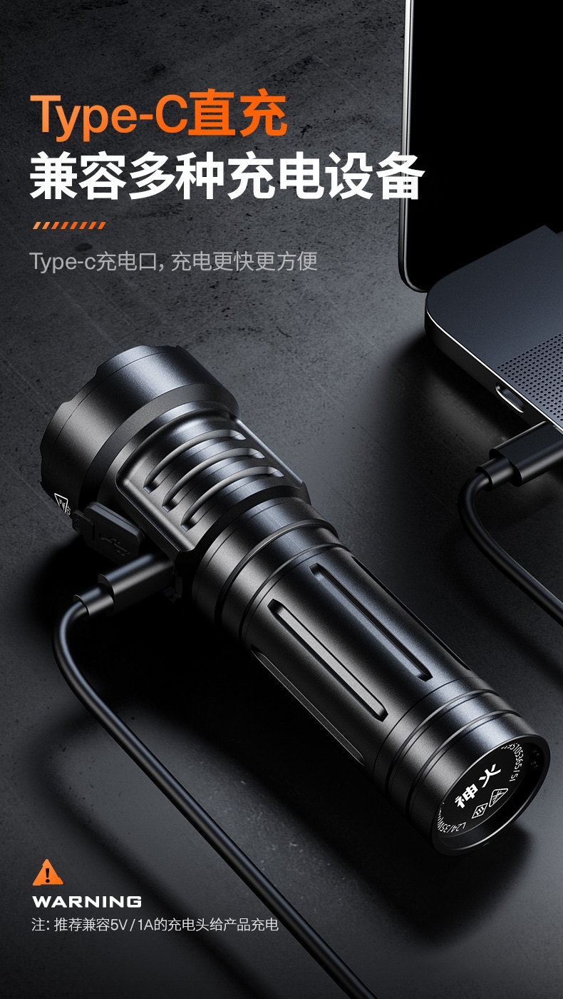 四档调光 Type-C充电 电量显示 铝合金筒身 持久续航 强力防水