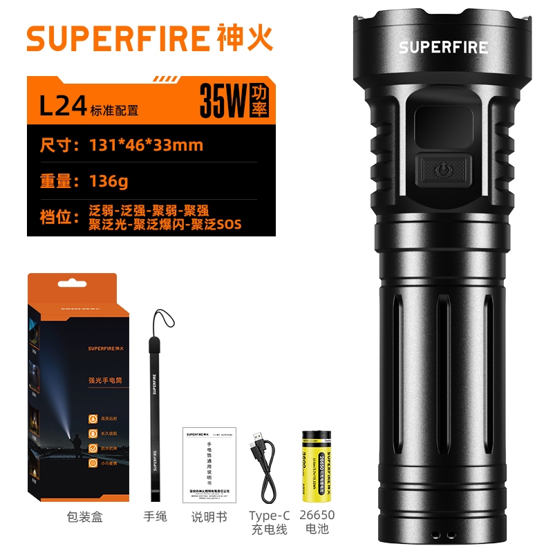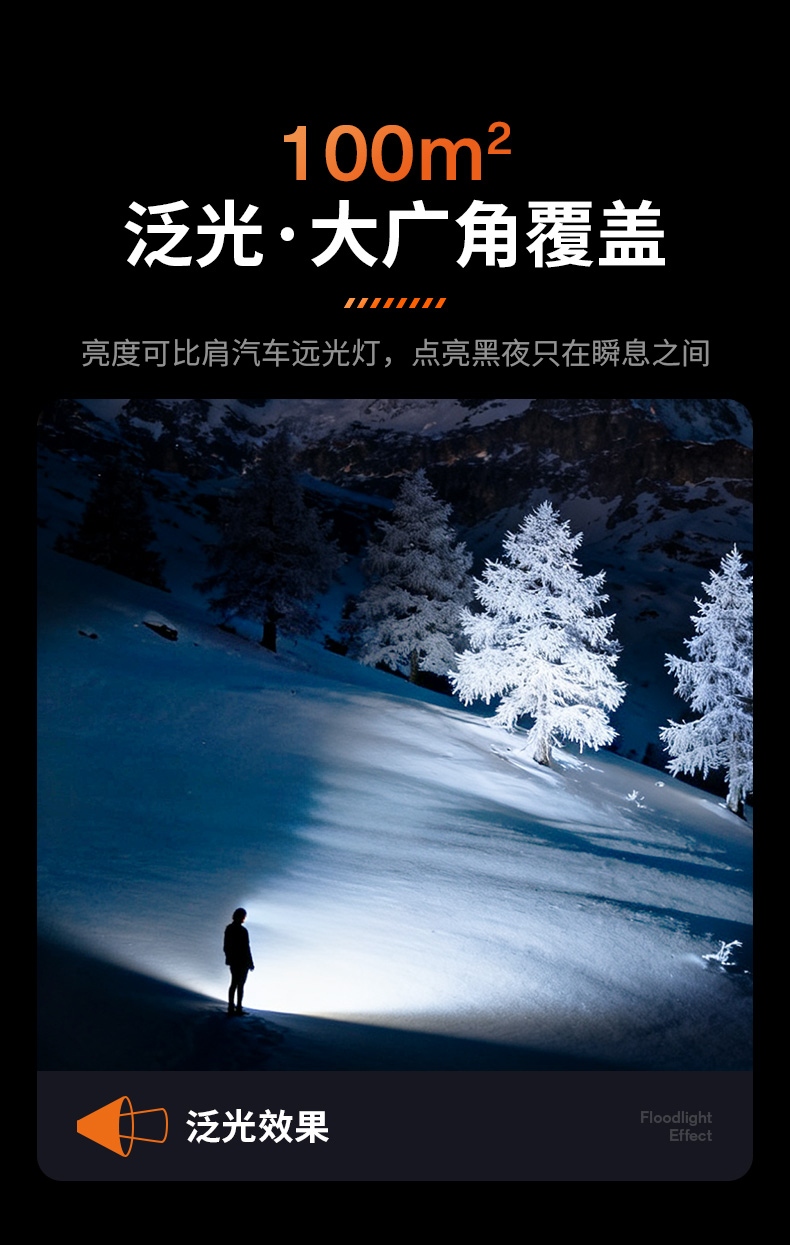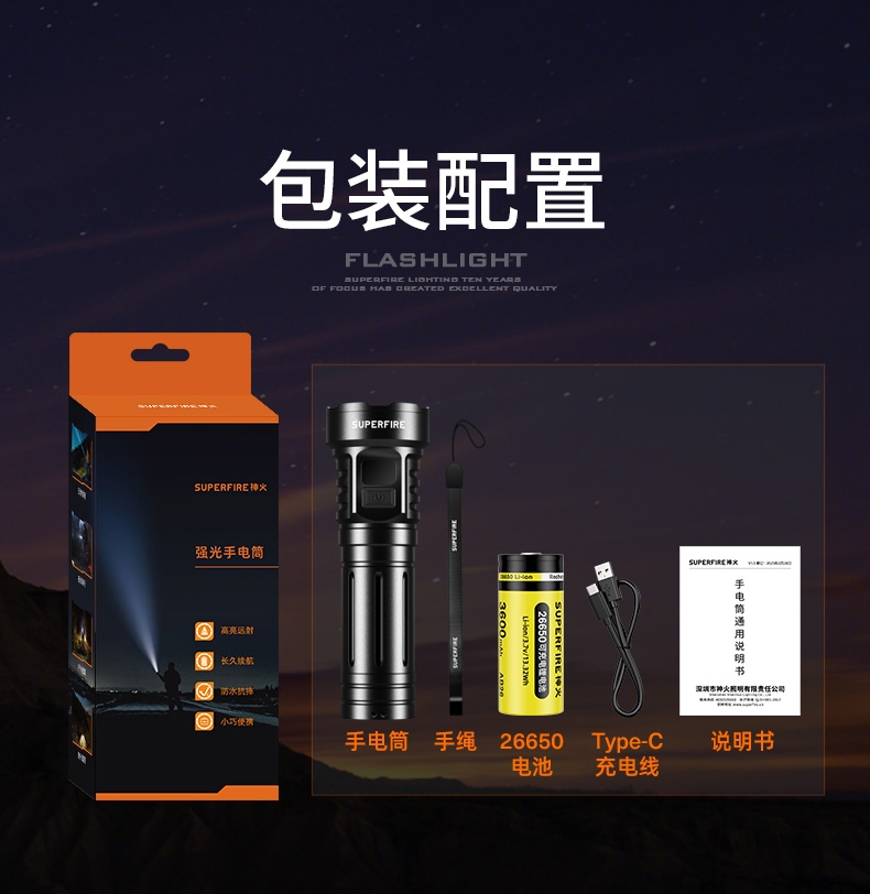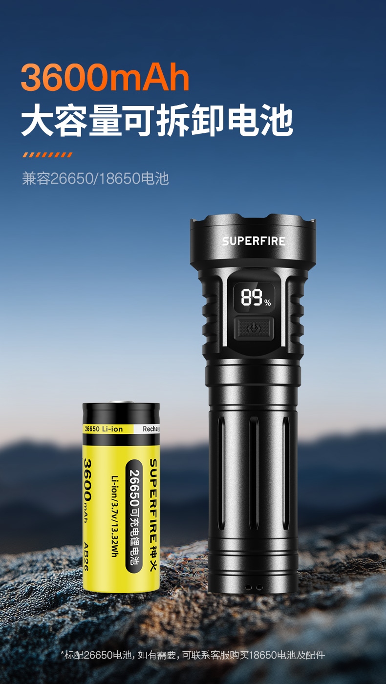 9、标配26650电池,容量大,照明更持久。