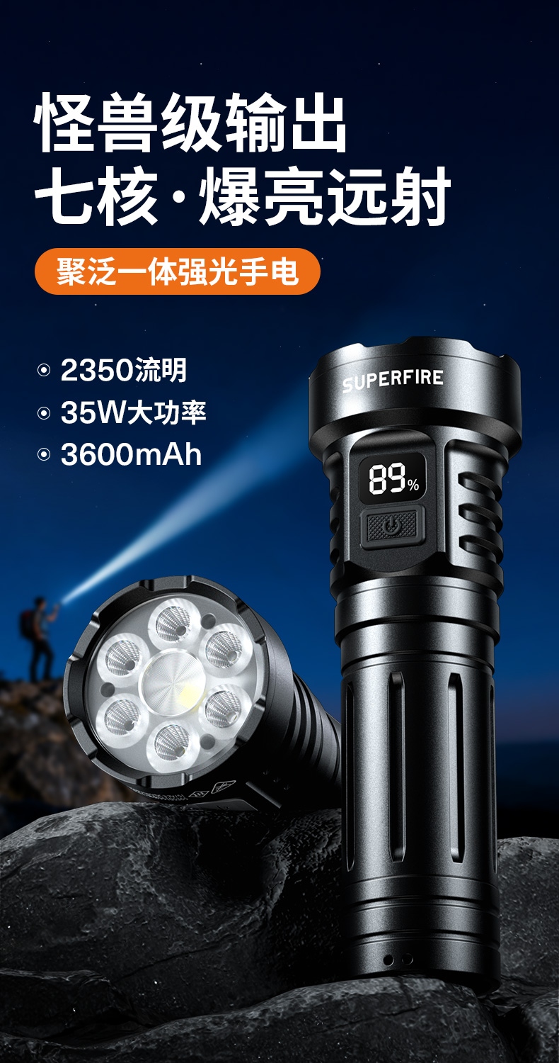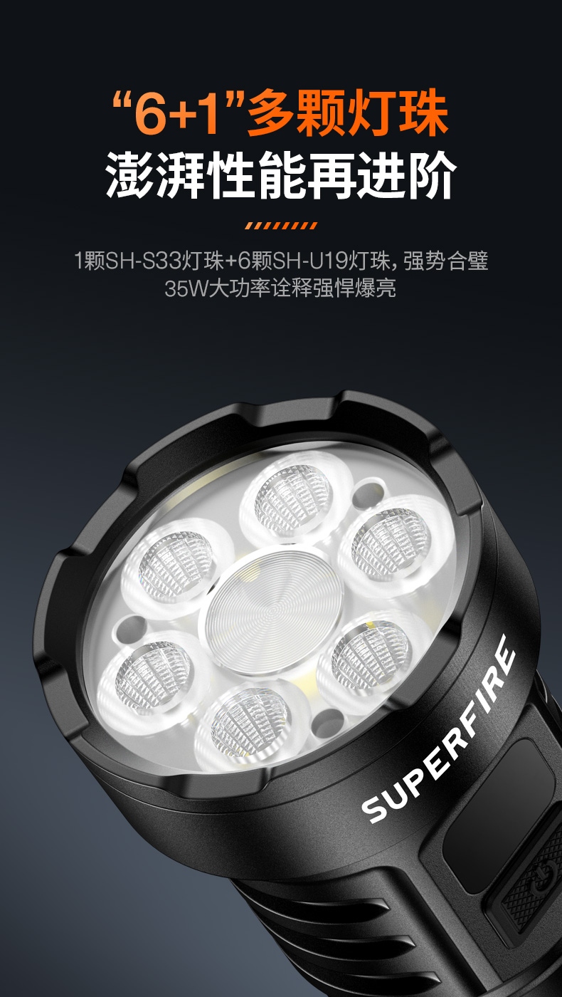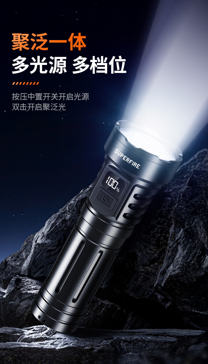 1、多颗高亮灯珠,亮度高,照明效果更好。 2、多种安全程序,可有效保护手电使用安全,延长手电使用寿命。 3、聚泛一体,远近兼容。