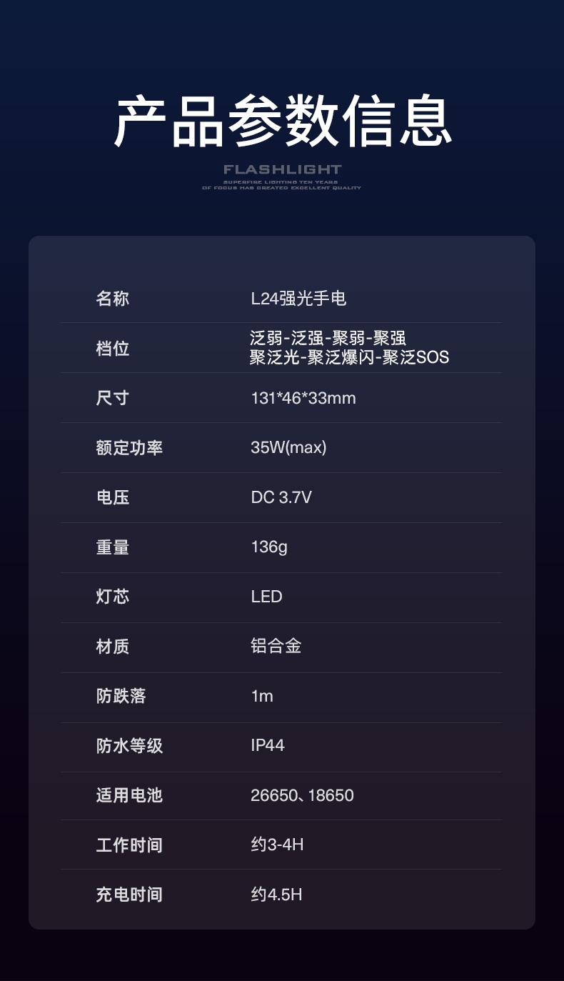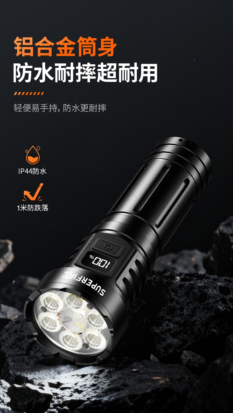 6、铝合金筒身,防水耐摔。