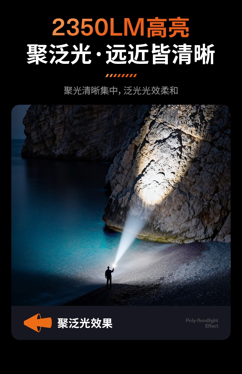 聚光主灯 亮度随心 轻按后端开关按钮,主灯强光点亮,续按依次切换主灯工作光-爆闪光。主灯开启状态下长按5秒,可实现光源色温转换。主灯关闭状态下长按5秒,可开启灯具最亮照明模式。 爆亮强光 亮如白昼 1500LM大功率高亮光源,点亮顷刻如白昼