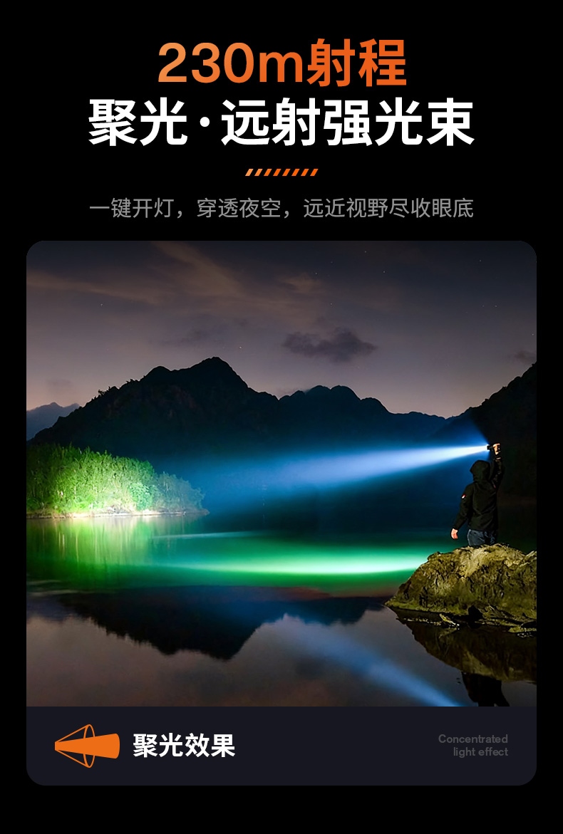 1、千米远射,射程更远,光斑更聚焦。 2、进口灯珠,亮度高,照明效果更好。 3、前后双按键,光源一键点亮,高亮瞬间开启。