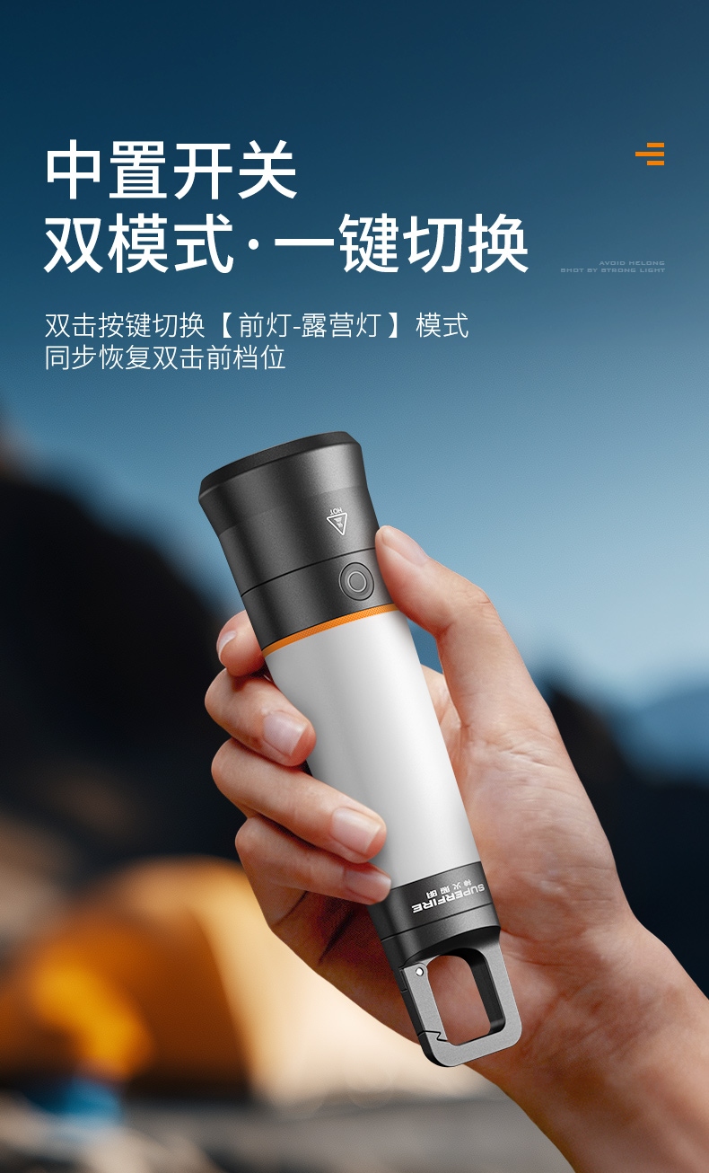 聚光主灯 亮度随心 轻按后端开关按钮,主灯强光点亮,续按依次切换主灯工作光-爆闪光。主灯开启状态下长按5秒,可实现光源色温转换。主灯关闭状态下长按5秒,可开启灯具最亮照明模式。 爆亮强光 亮如白昼 1500LM大功率高亮光源,点亮顷刻如白昼