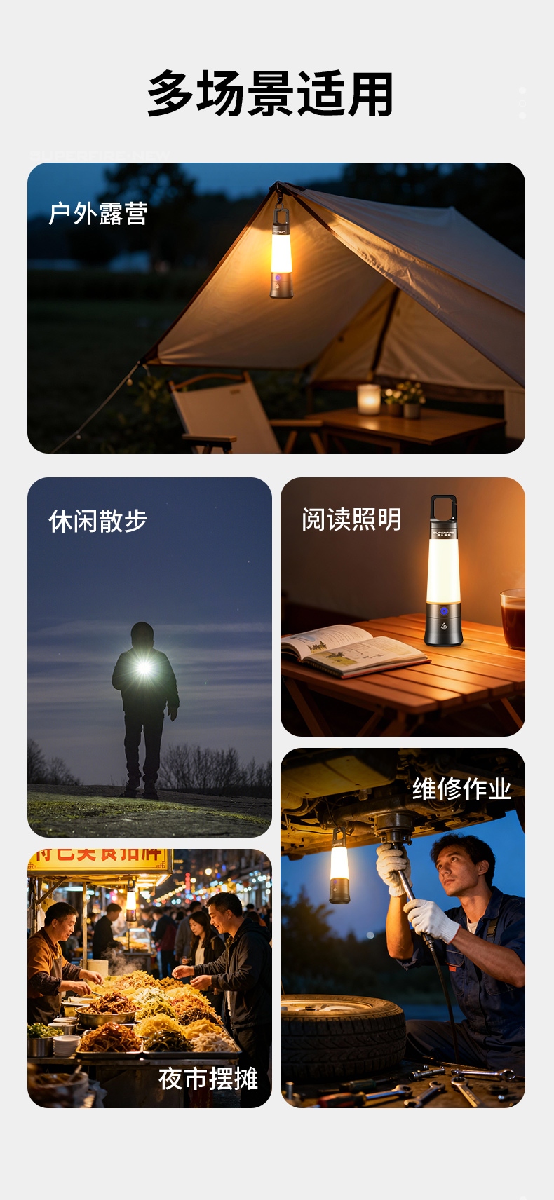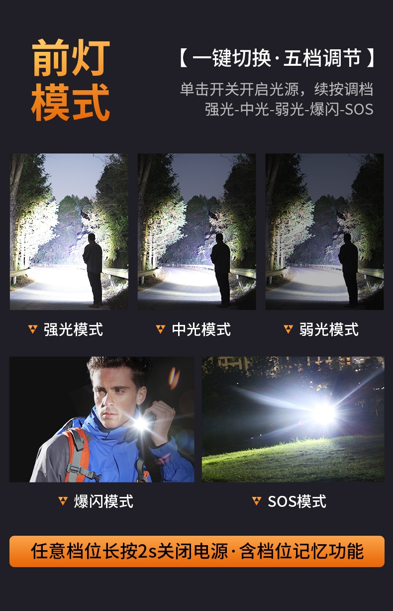 1、前灯+侧灯,2种照明模式。 2、多档调光,可满足不同使用场景下的照明需求。 3、多种光源模式,使用效果更多样。