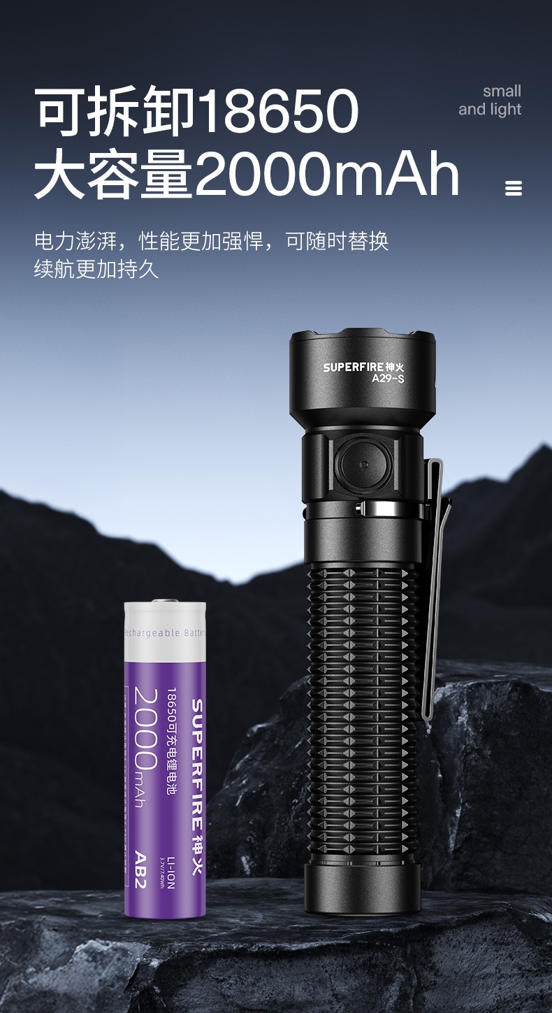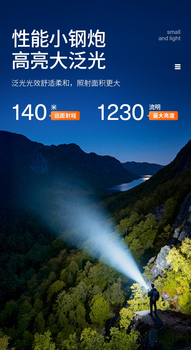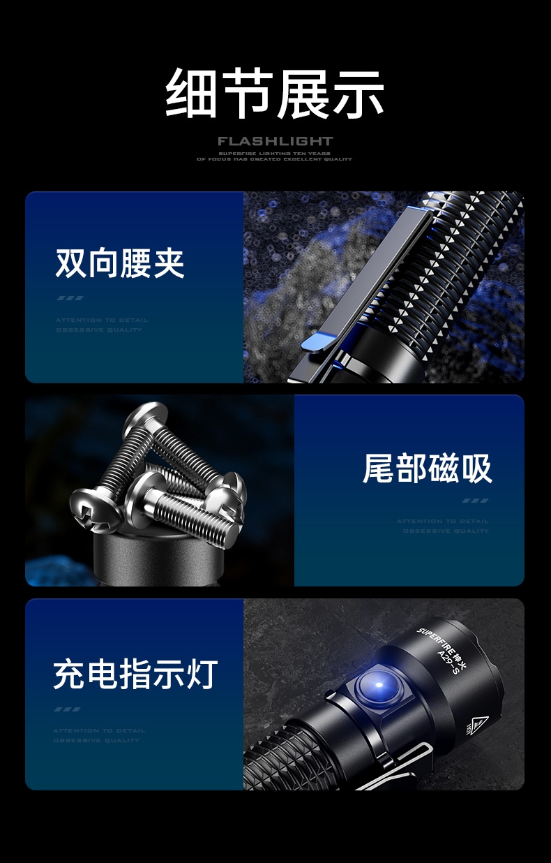 1、多档调光,可满足不同使用场景下的照明需求。 2、多种安全程序,可有效保护手电使用安全,延长手电使用寿命。 3、精致外观,含磁吸、双向腰夹,时尚小巧,方便携带。