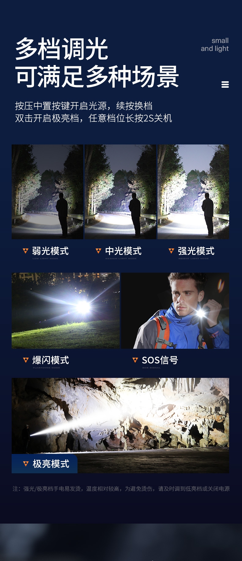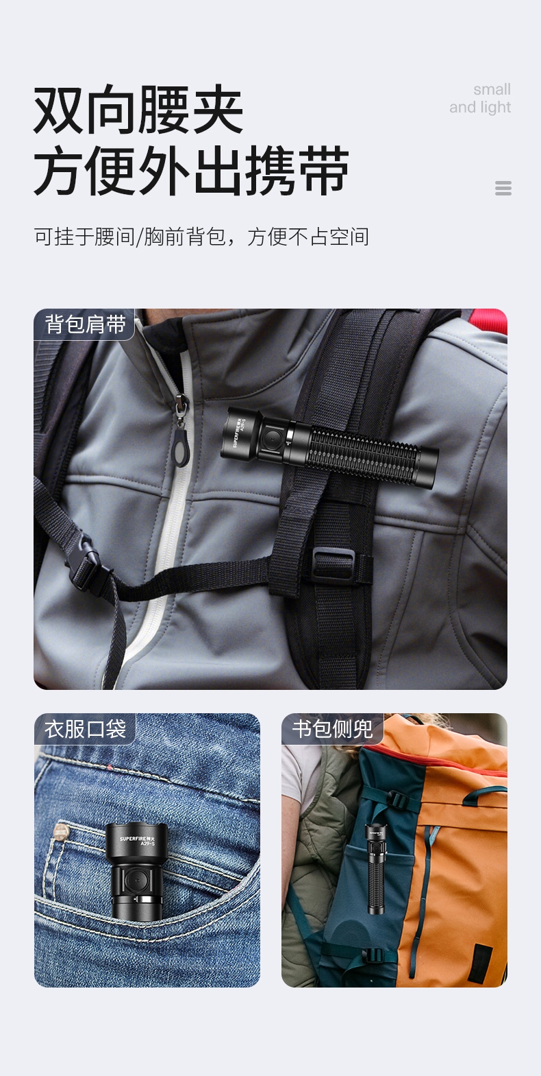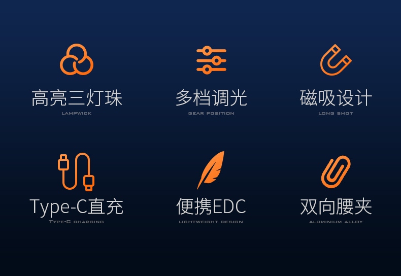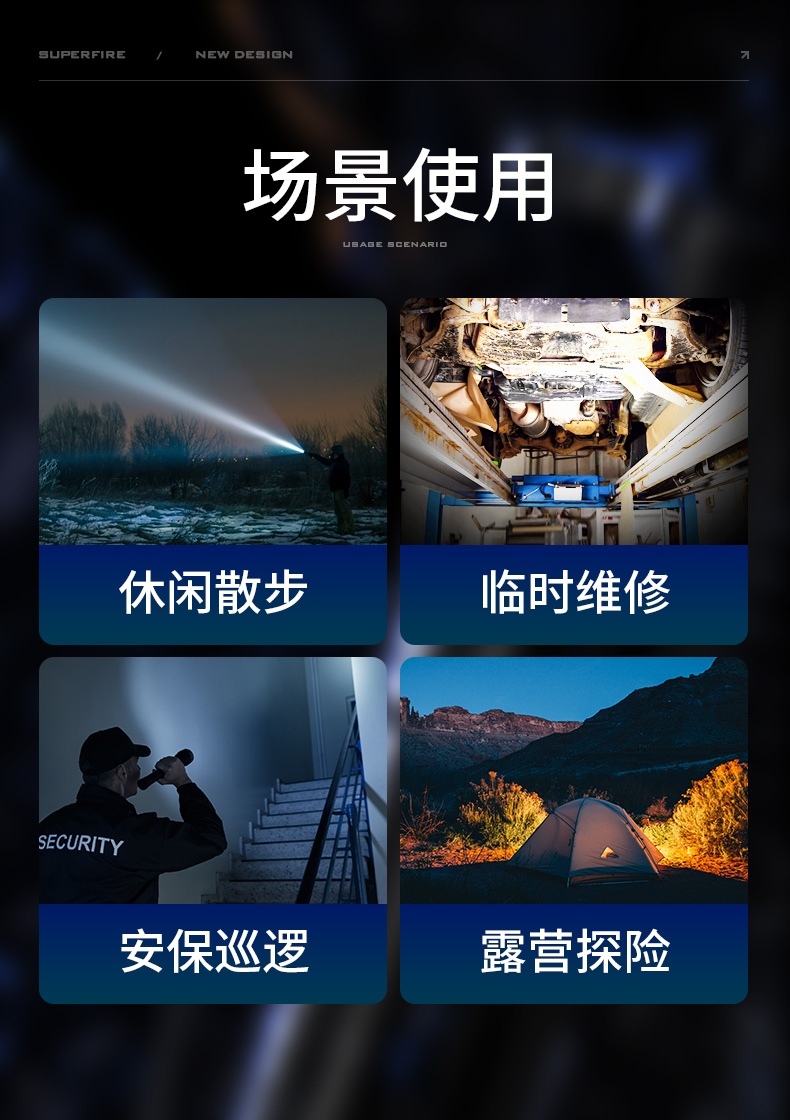 1、多档调光,可满足不同使用场景下的照明需求。 2、多种安全程序,可有效保护手电使用安全,延长手电使用寿命。 3、精致外观,含磁吸、双向腰夹,时尚小巧,方便携带。