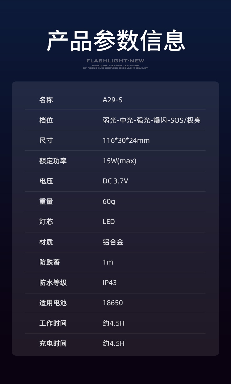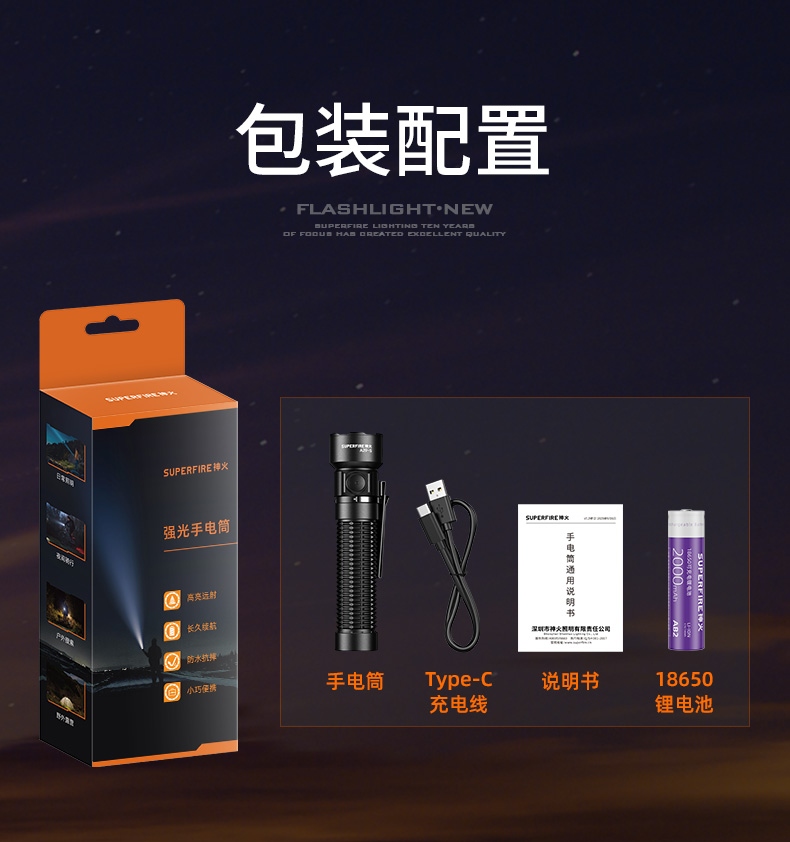 四档调光 Type-C充电 电量显示 铝合金筒身 持久续航 强力防水
