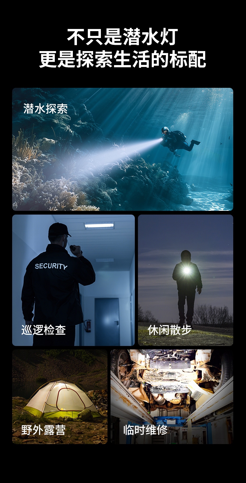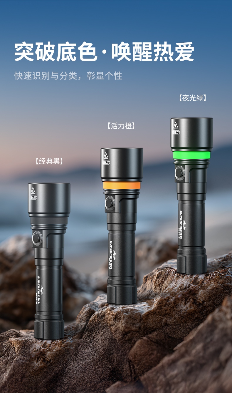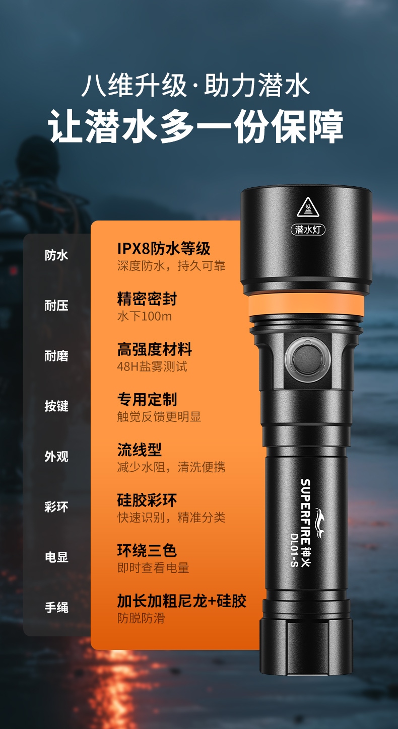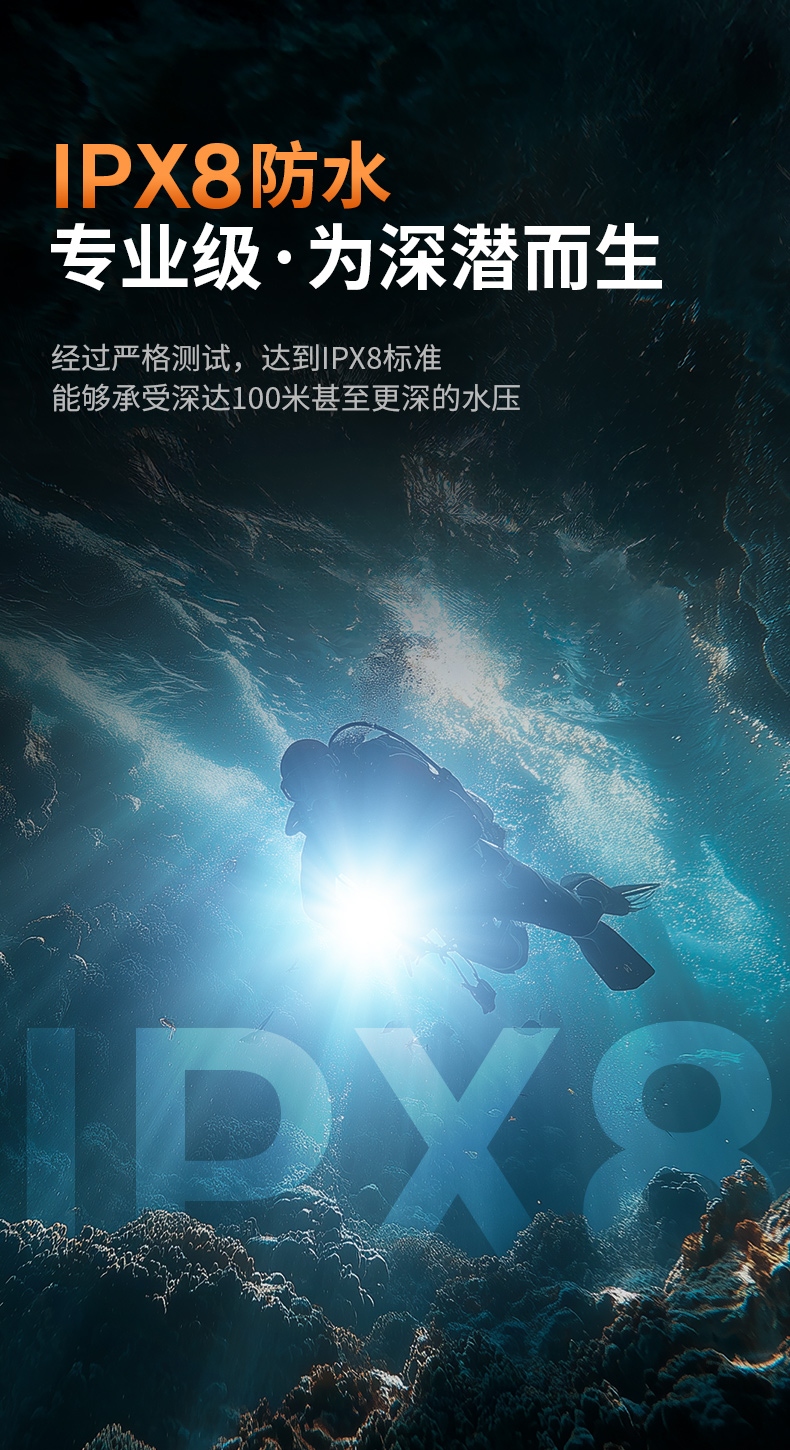 专业级防水设计:经过严格测试,达到IP68标准,能够承受深达100米甚至更深的水压,是深海探索的理想选择。 坚固耐用材料:外壳使用航空级铝合金制造,具备出色的抗冲击和耐腐蚀性能,适合各种恶劣环境下的使用。