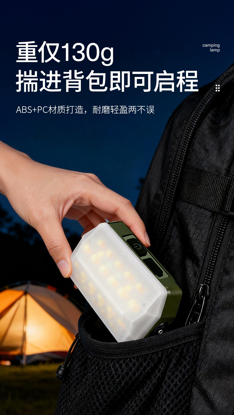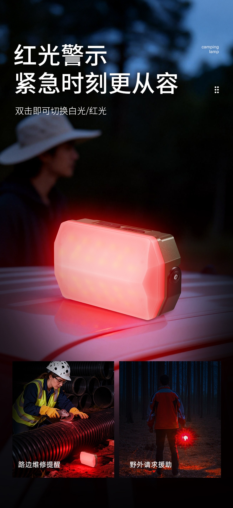 1、充电时一颗蓝色指示灯闪烁 ,依次常亮,充满四颗蓝色指示灯常亮 。 2、多样化充电,使用方便;设有type-c充电接口,可使用充电器、充电宝、电脑等设备为灯具充电。 3、多功能营地灯,此灯带有磁吸、螺母孔、挂钩、支架等功能。