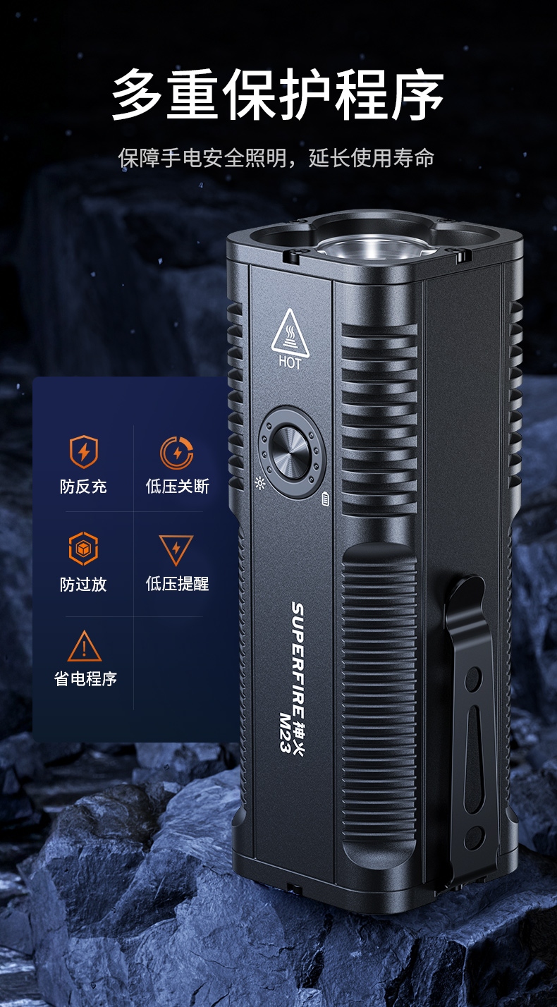 2、最高亮度6000LM,多档照明,满足不同场景的使用要求。