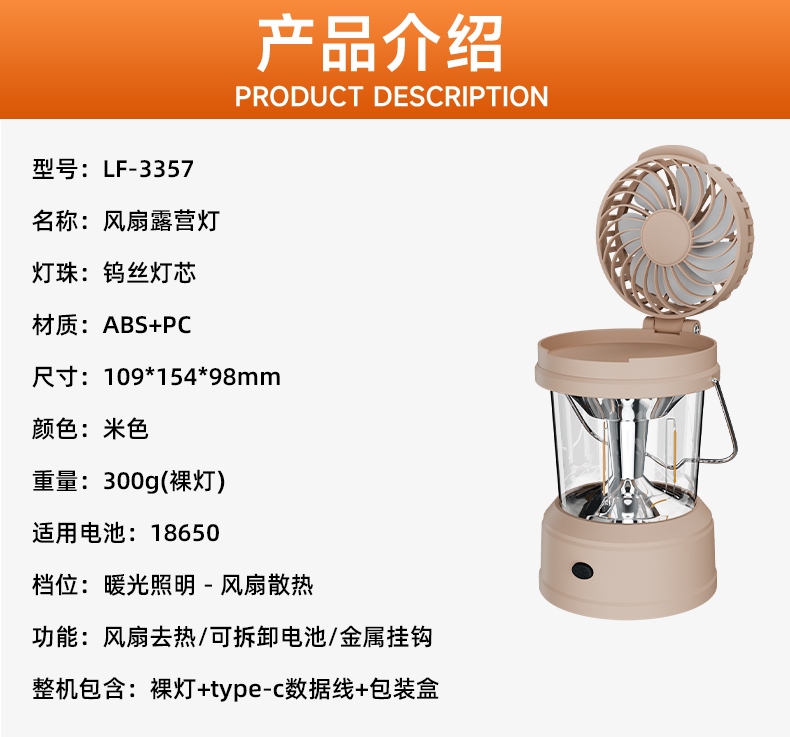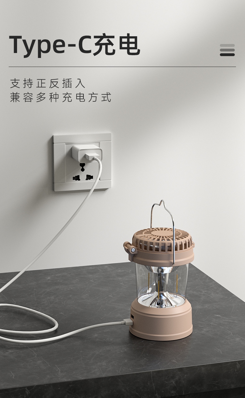 1、风扇和照明功能合二为一,能同时满足露营时的通风跟夜间活动时照明的需求。 2、多样化充电,使用方便:设有Type-c充电口,可使用充电器、充电宝、电脑等设备为灯具充电。 3、此营地灯可边充电边使用照明功能。