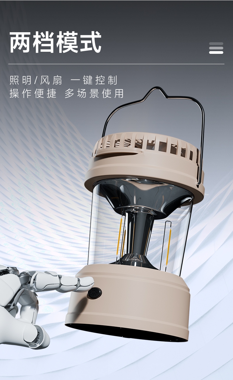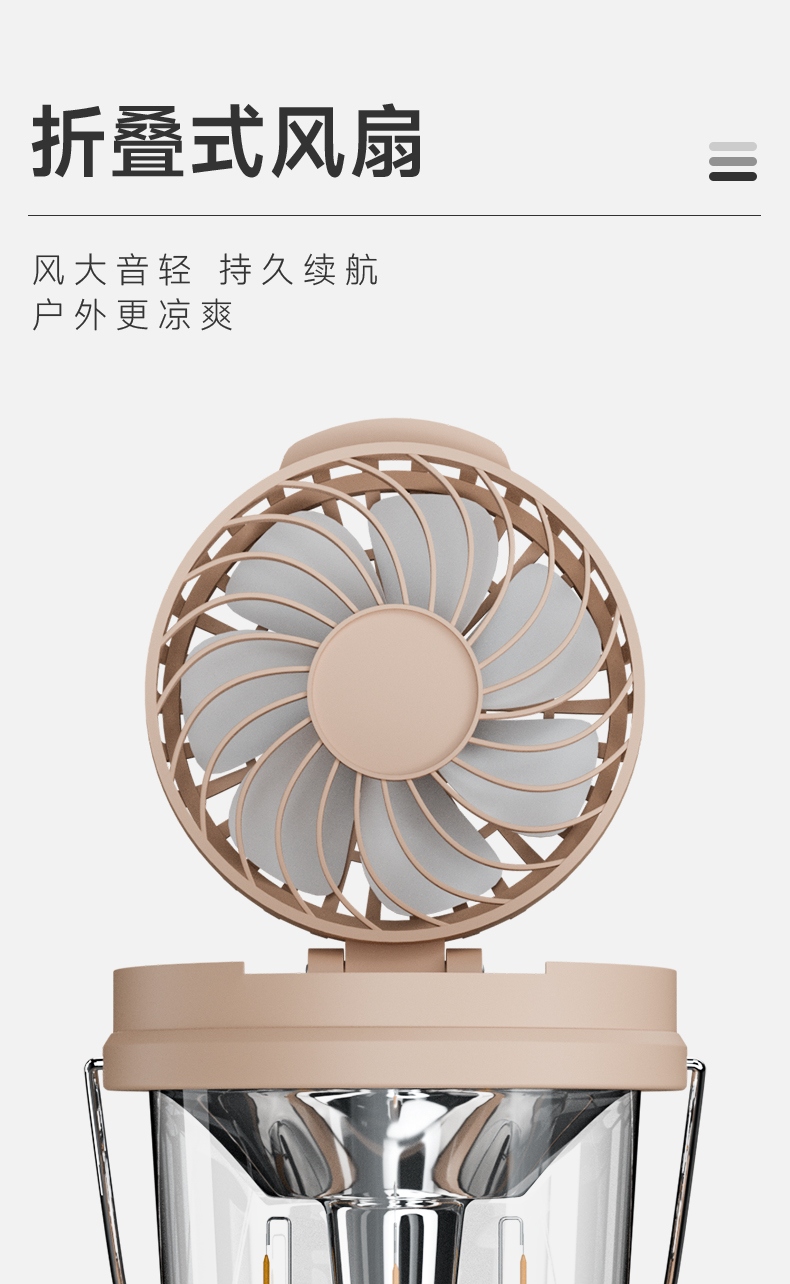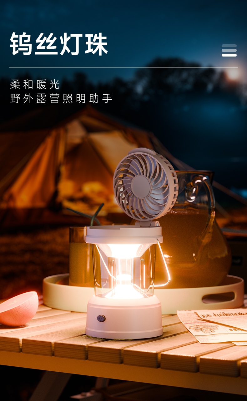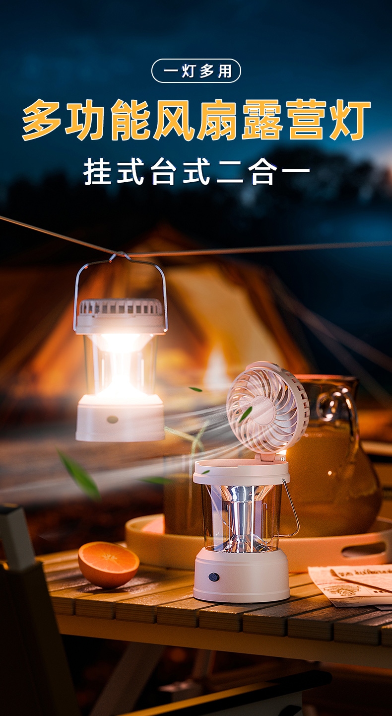 1、风扇和照明功能合二为一,能同时满足露营时的通风跟夜间活动时照明的需求。