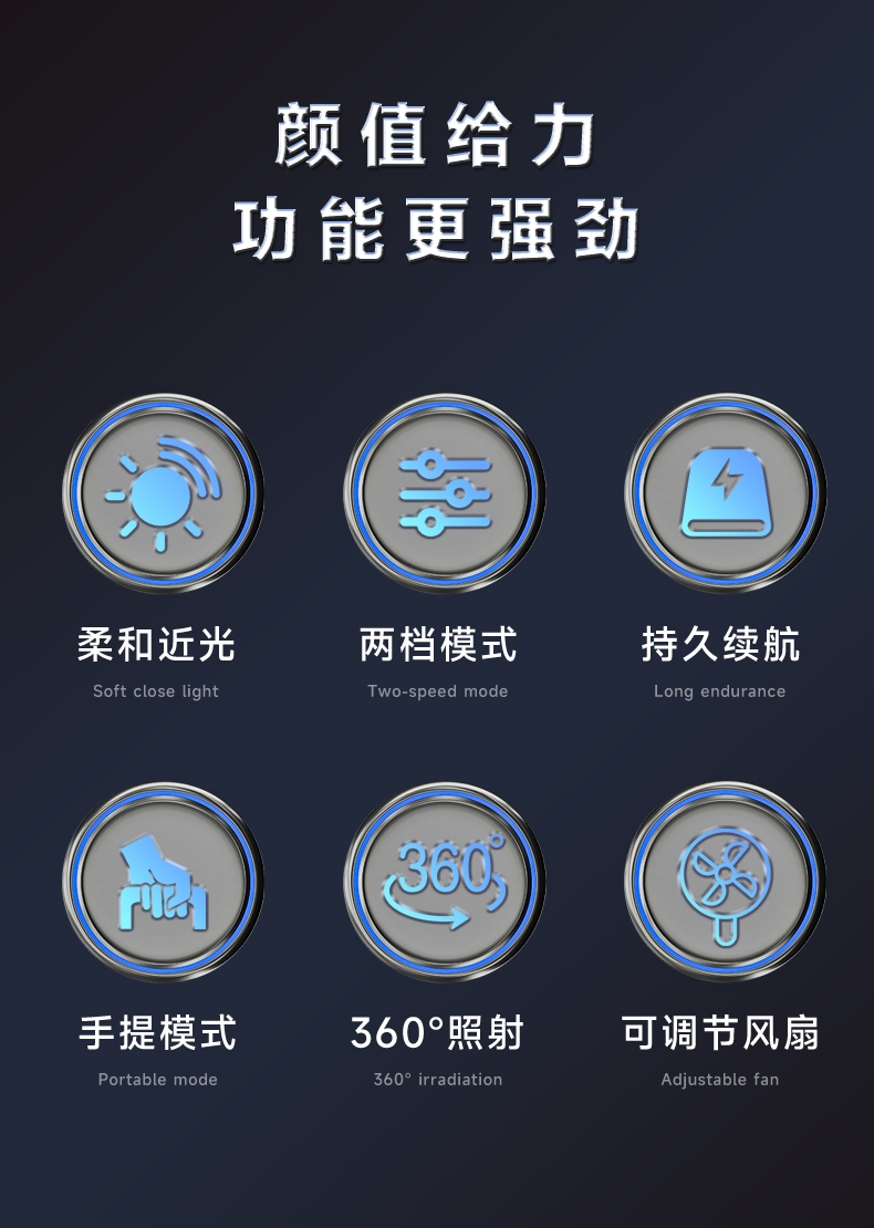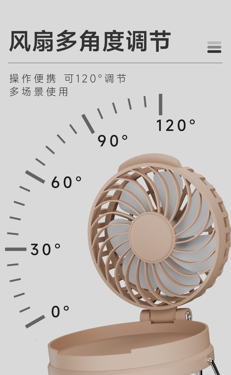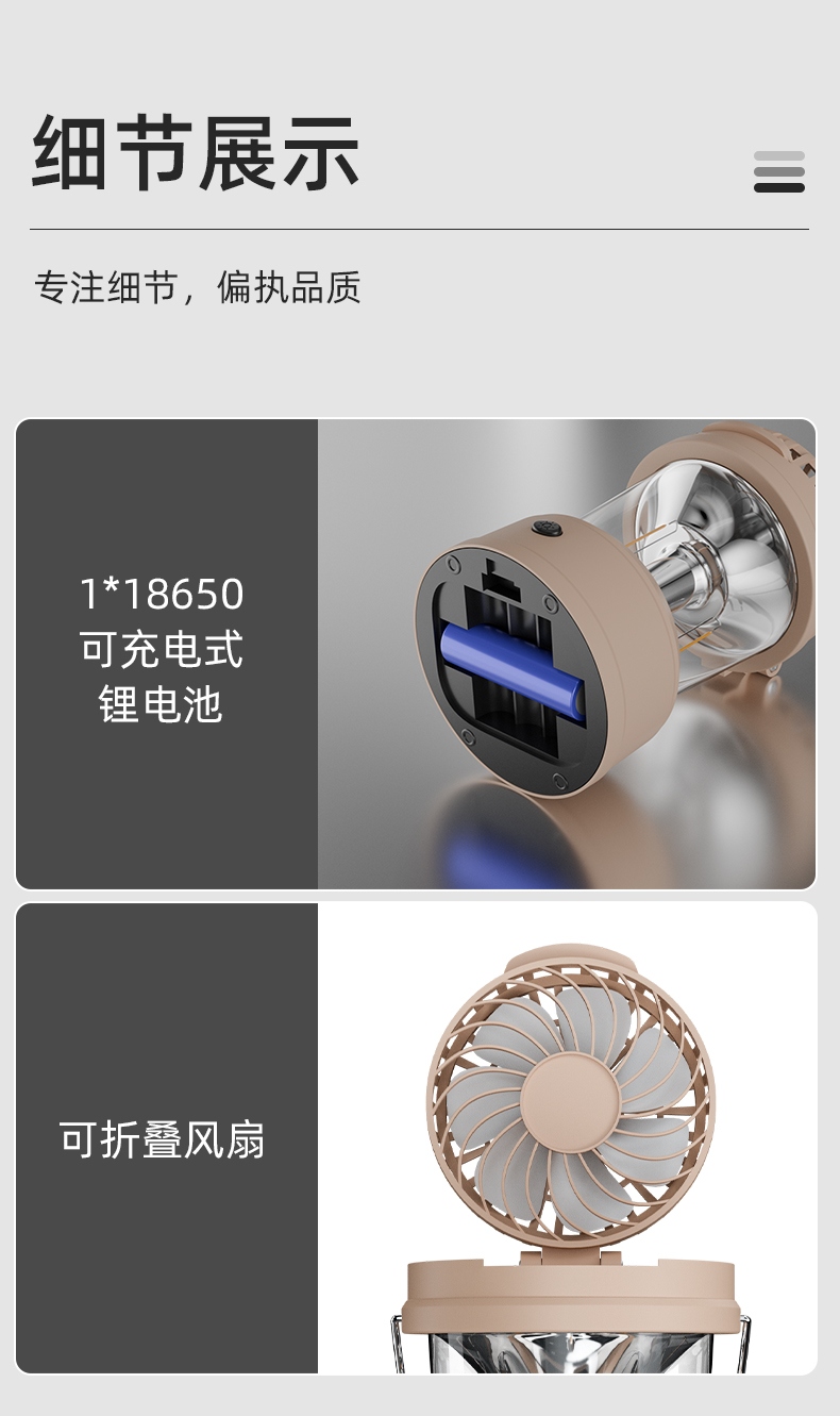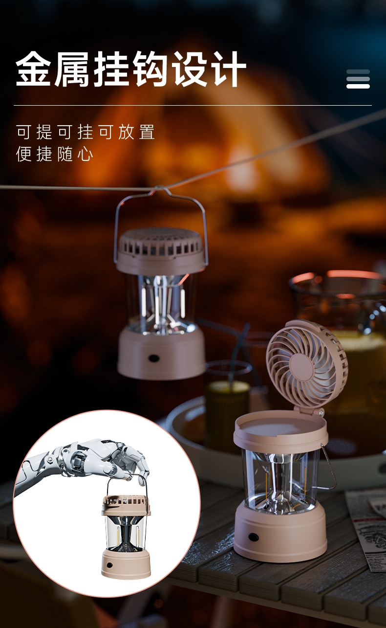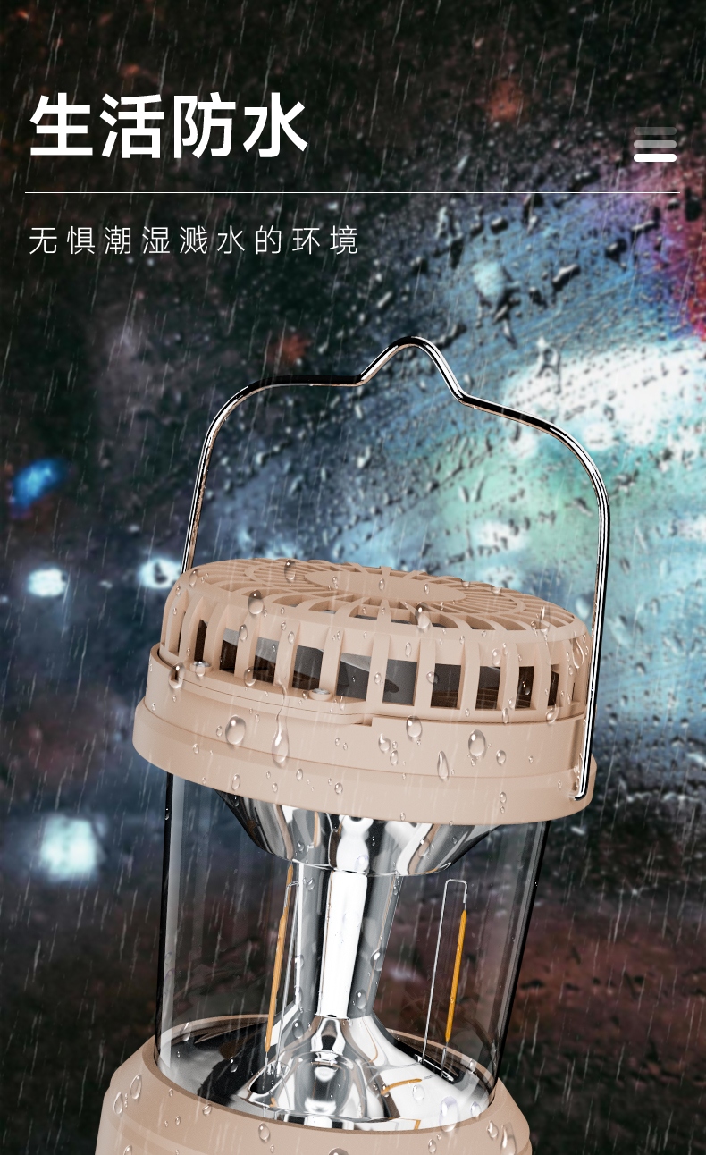 1、风扇和照明功能合二为一,能同时满足露营时的通风跟夜间活动时照明的需求。
