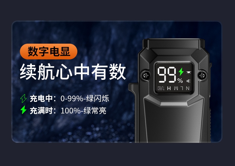 3、设有数字电量显示,智能数显(00-100%),充电时闪烁,充满常亮;