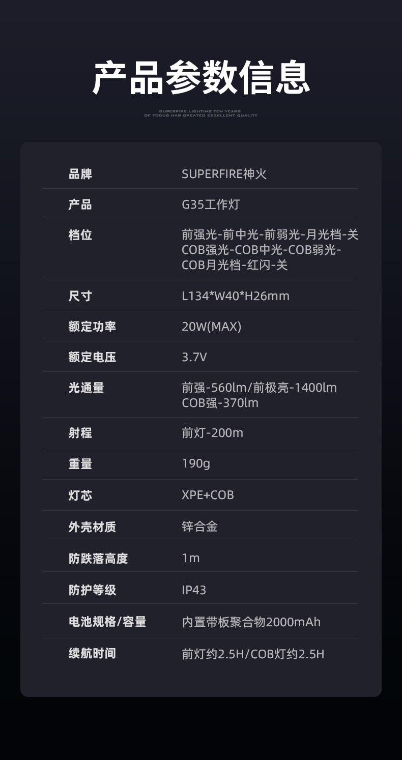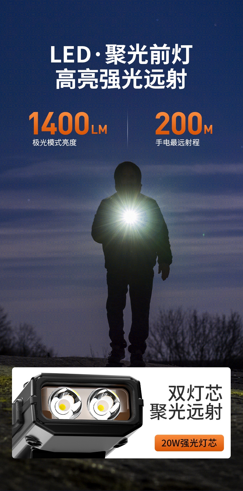 前灯极亮:1400LM、前灯强光:560LM、COB灯强光:370LM