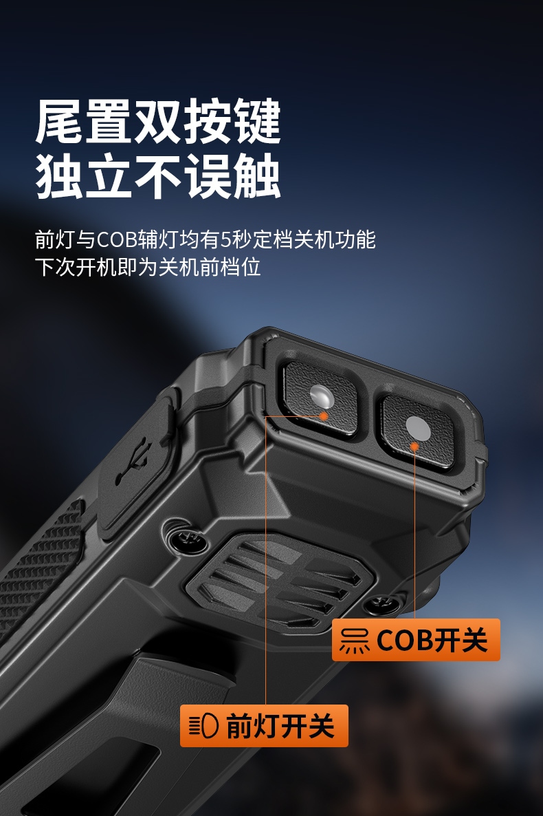 聚光主灯 亮度随心 轻按后端开关按钮,主灯强光点亮,续按依次切换主灯工作光-爆闪光。主灯开启状态下长按5秒,可实现光源色温转换。主灯关闭状态下长按5秒,可开启灯具最亮照明模式。 爆亮强光 亮如白昼 1500LM大功率高亮光源,点亮顷刻如白昼