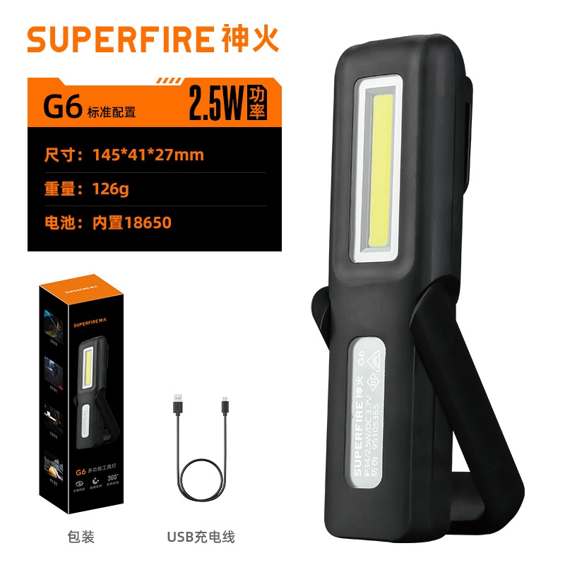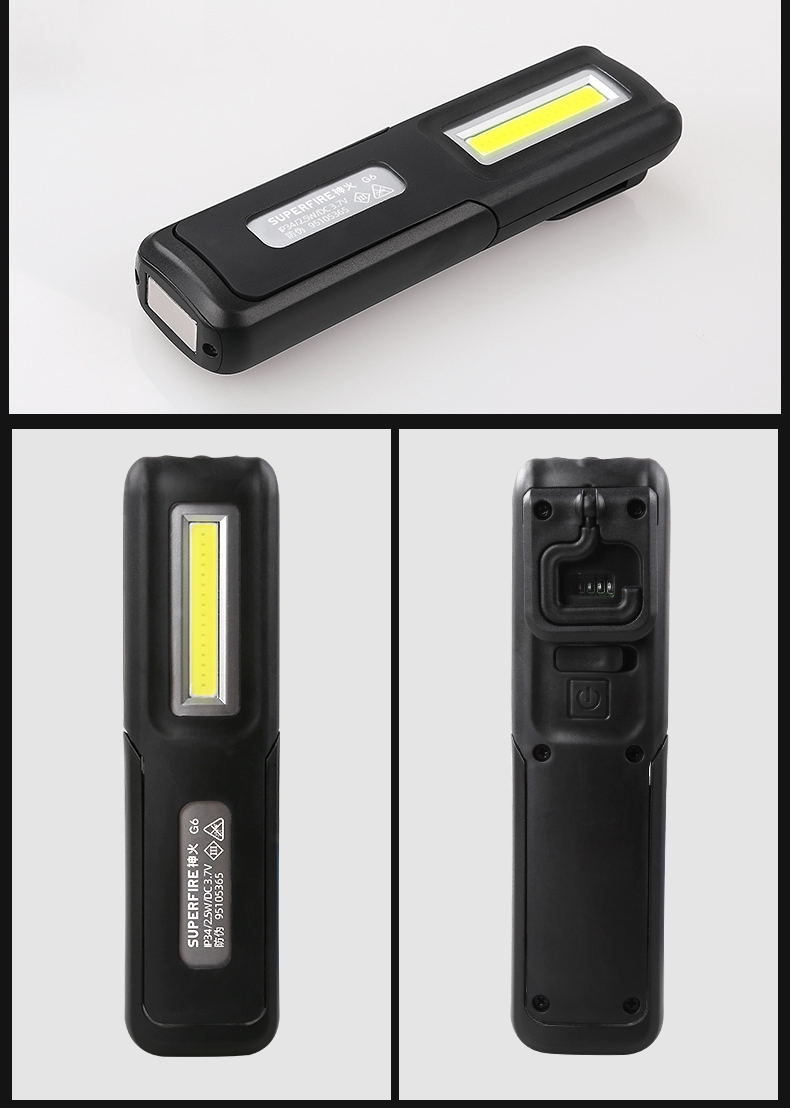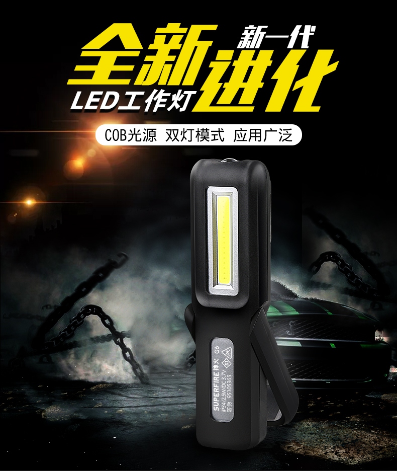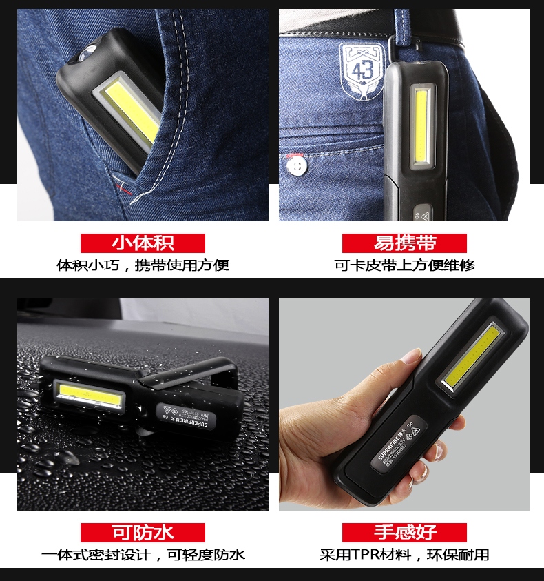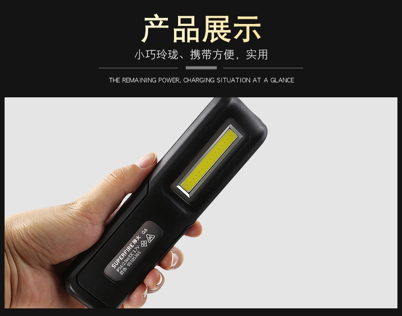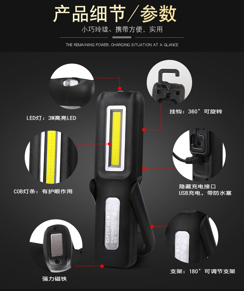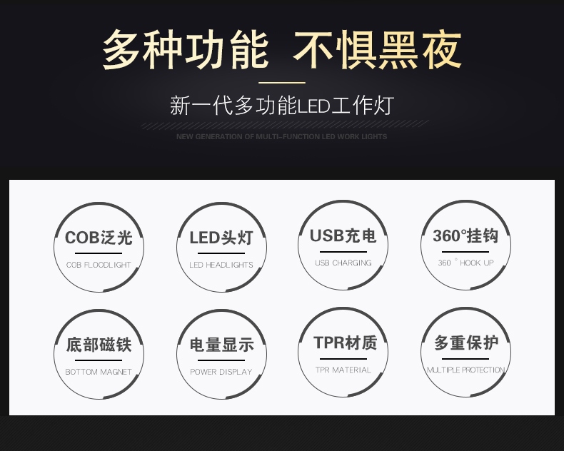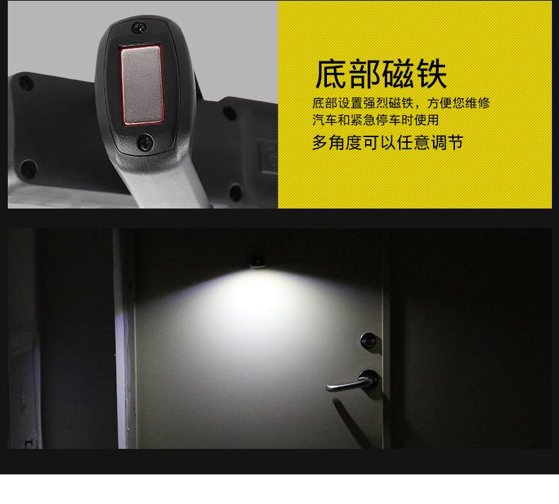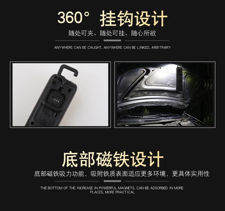 多功能工作灯,具有普通照明和COB照明模式,带支架和挂钩可随意站立或者挂起,底部带磁铁,机身带电量显示(使用TPR材料)