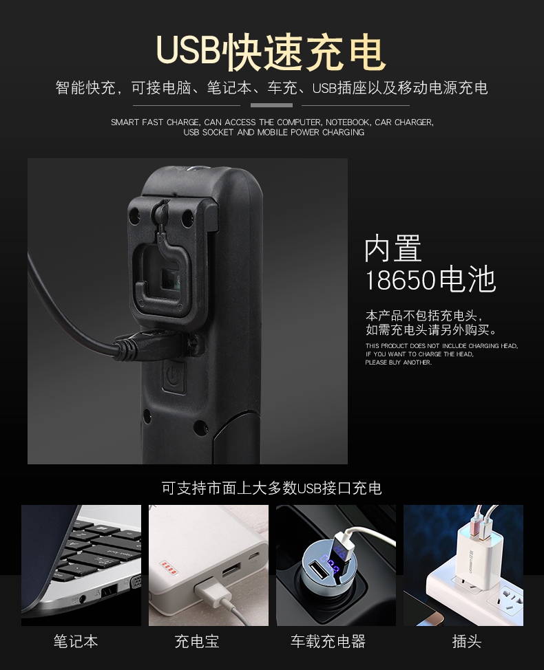 1.单击左边开关开启感应功能,同时开启强光档,续按关闭感应功能(关闭感应功能,光源不会关闭),当感应功能开启时,单击右边开关可正常调节档位。 2.多样化充电,使用方便:设有Type-c充电口,可使用充电器、充电宝、电脑等设备为灯具充电。 3.电量显示:实时