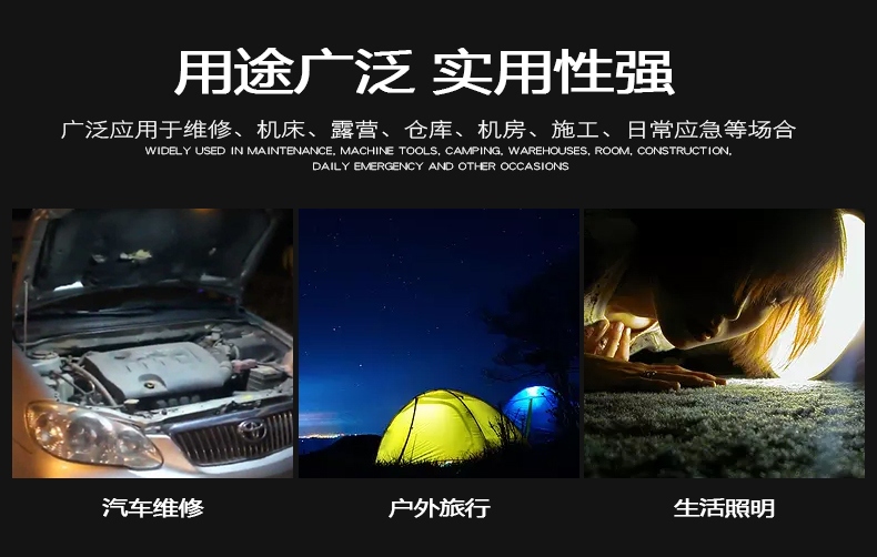 1、多档调光,可满足不同使用场景下的照明需求; 2、含提手,握感更舒适。携带更简单; 3、新型高亮远射灯珠,60W大功率,亮度高,照明效果好。