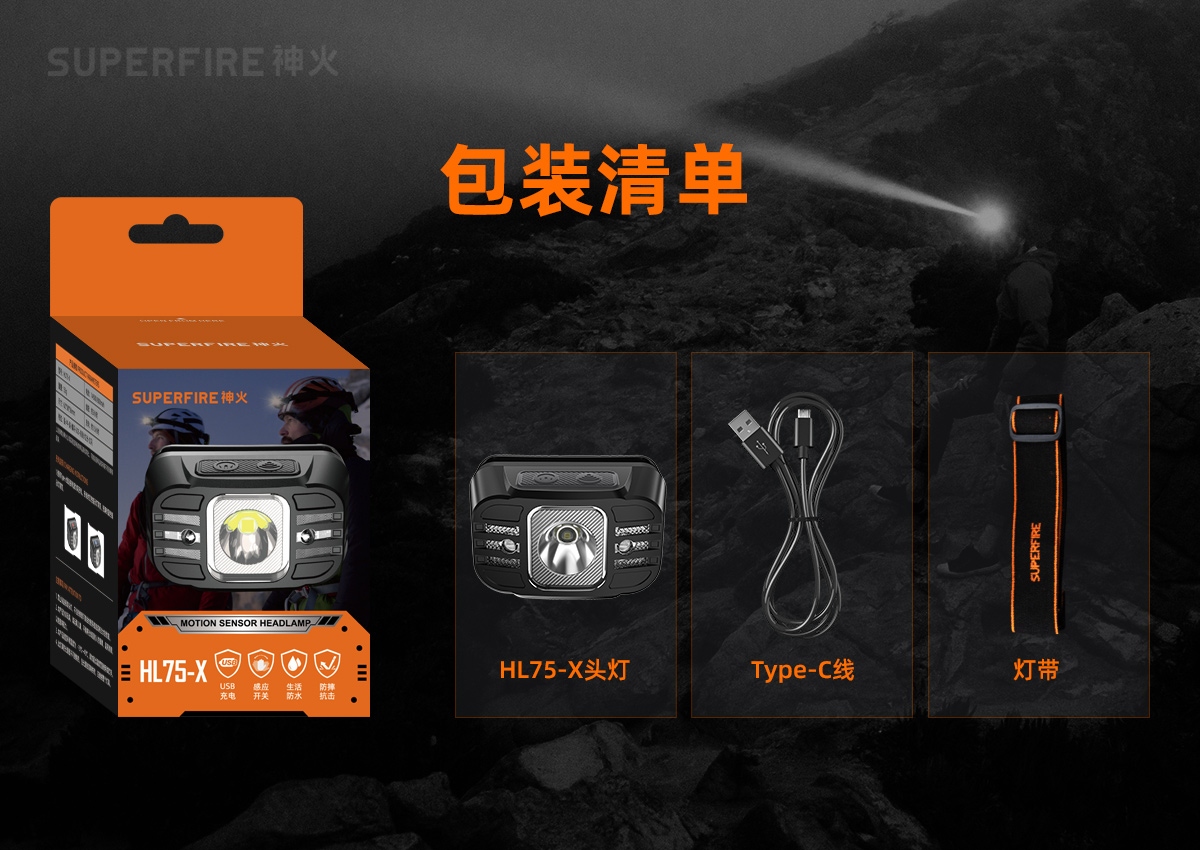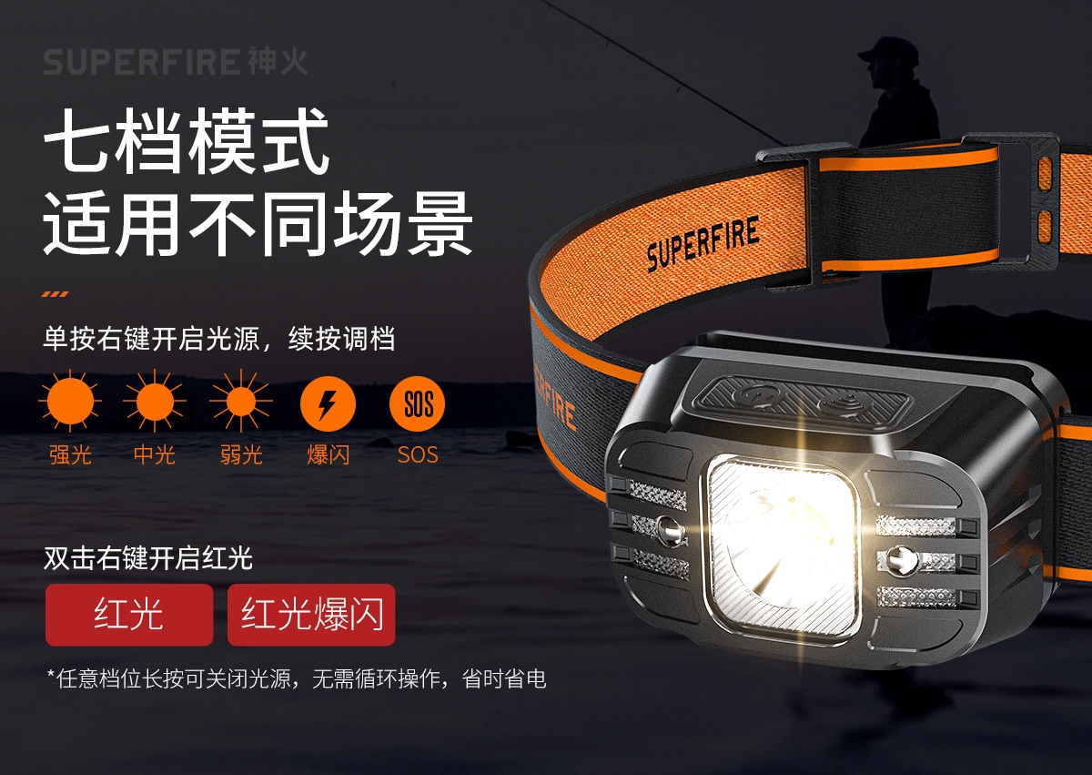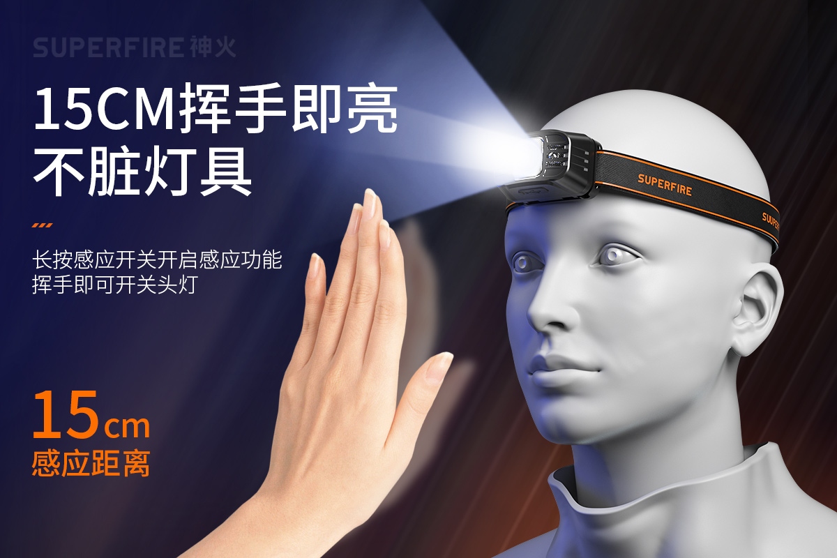 强光亮度,运动头灯,前后均衡设计,轻便不压头,可调节式头灯带,佩戴方便舒适,伸缩调焦,光照范围大,照射距离远,头灯角度调节,超90度角度随意调节,适宜各种环境使用