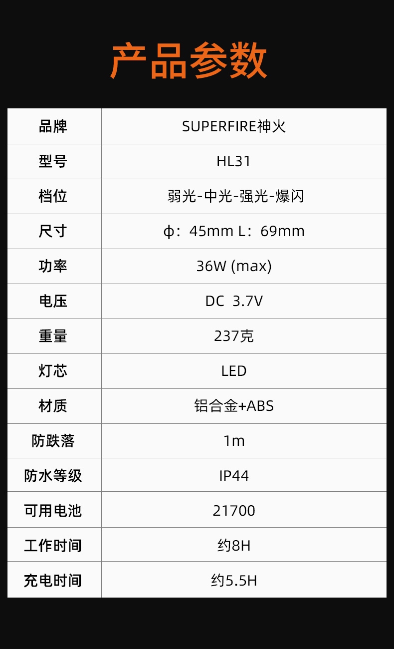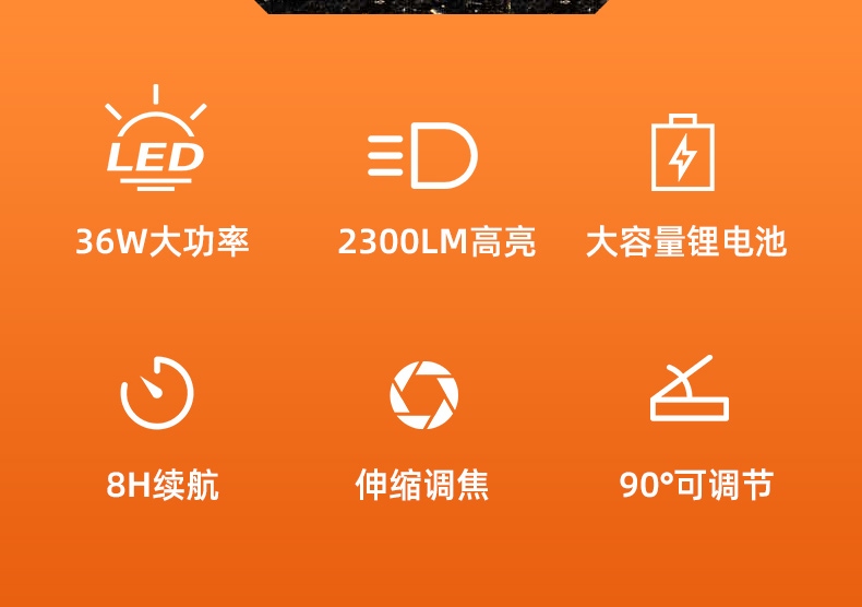 1、铝合金+ABS材质,36W大功率,亮度高达2300流明,四个档位满足不同的使用需求; 2、伸缩调焦:光照范围大,照射距离远 ,可自由调节光圈的大小/聚光/泛光; 3、头灯角度调节:超90°角度随意调节,适宜各环境使用