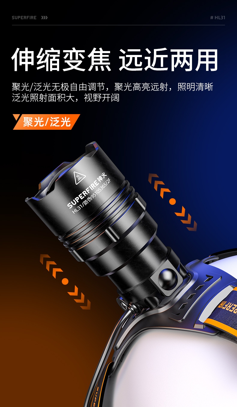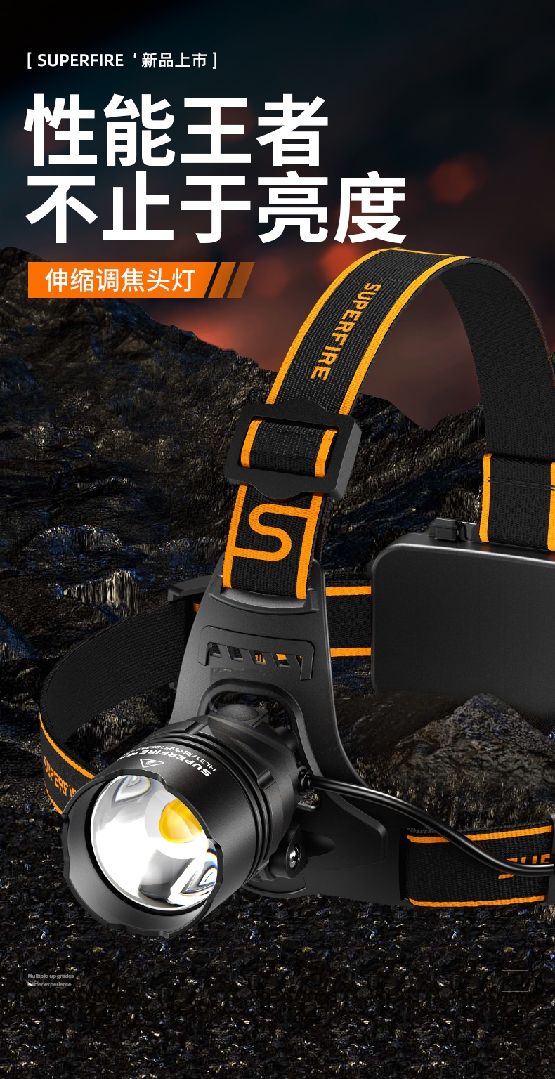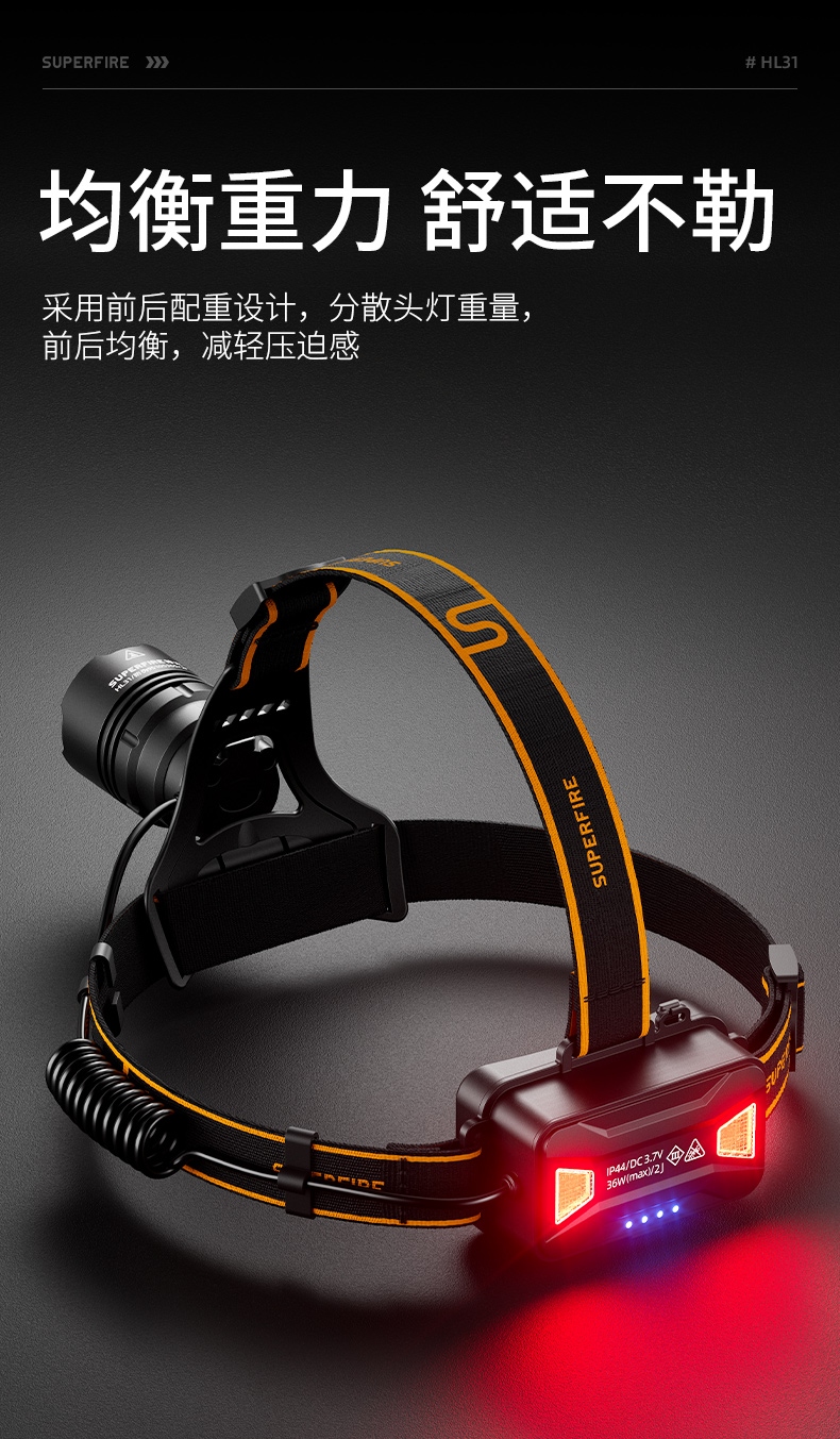强光亮度,运动头灯,前后均衡设计,轻便不压头,可调节式头灯带,佩戴方便舒适,伸缩调焦,光照范围大,照射距离远,头灯角度调节,超90度角度随意调节,适宜各种环境使用