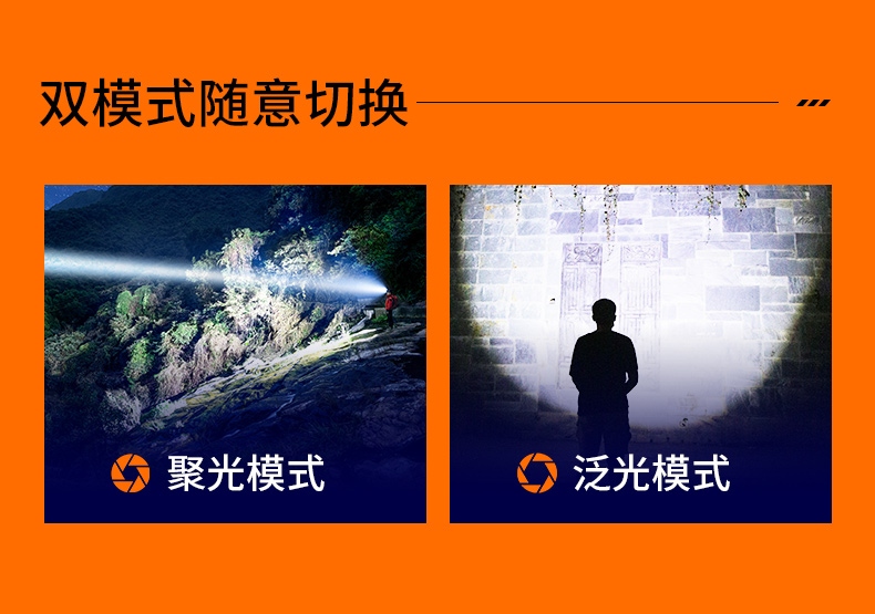 聚光主灯 亮度随心 轻按后端开关按钮,主灯强光点亮,续按依次切换主灯工作光-爆闪光。主灯开启状态下长按5秒,可实现光源色温转换。主灯关闭状态下长按5秒,可开启灯具最亮照明模式。 爆亮强光 亮如白昼 1500LM大功率高亮光源,点亮顷刻如白昼