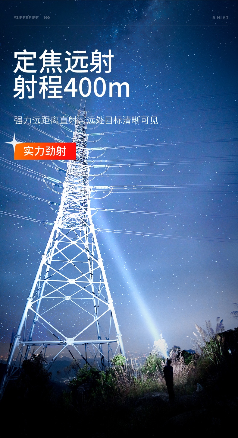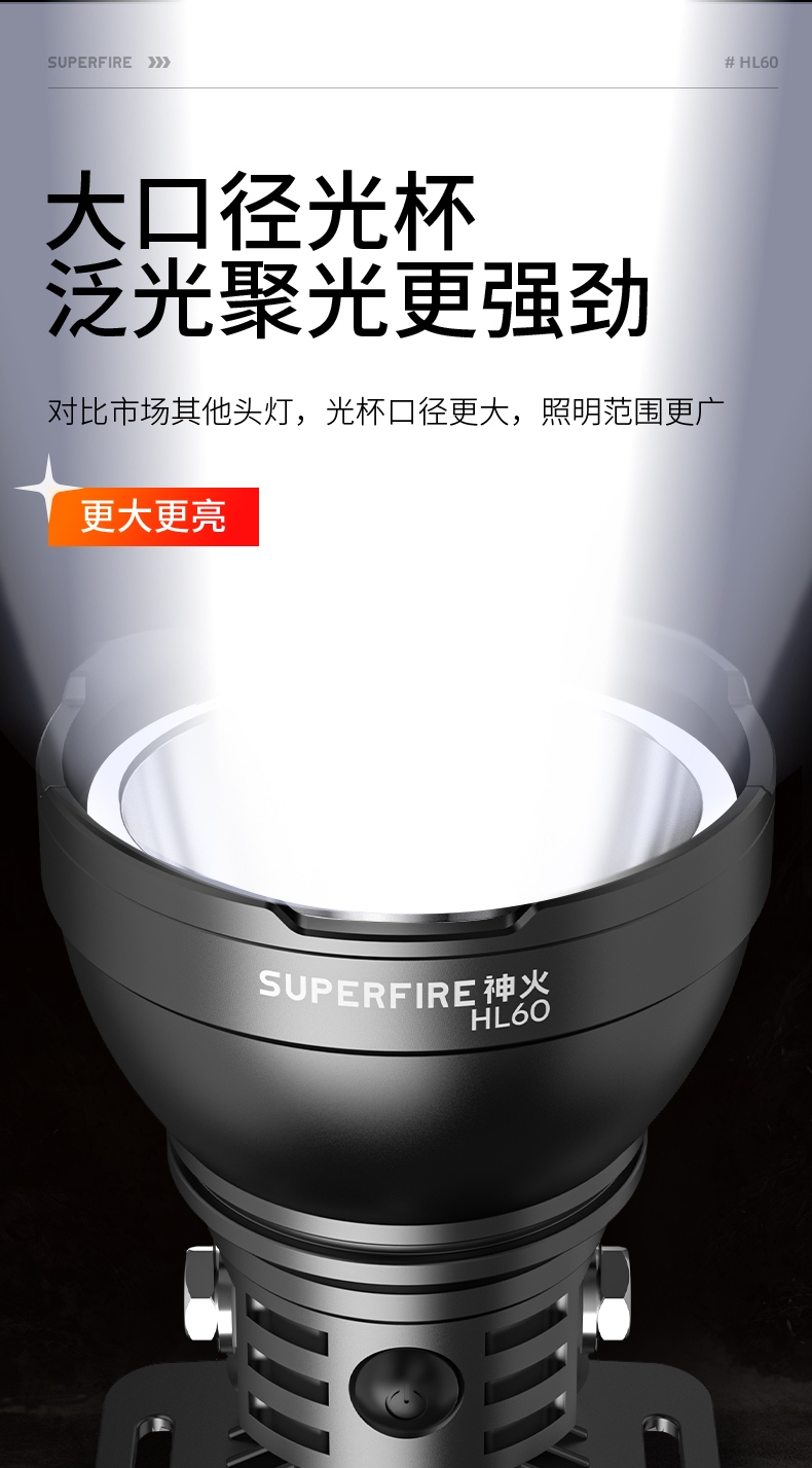 1、千米远射,射程更远,光斑更聚焦。 2、进口灯珠,亮度高,照明效果更好。 3、前后双按键,光源一键点亮,高亮瞬间开启。