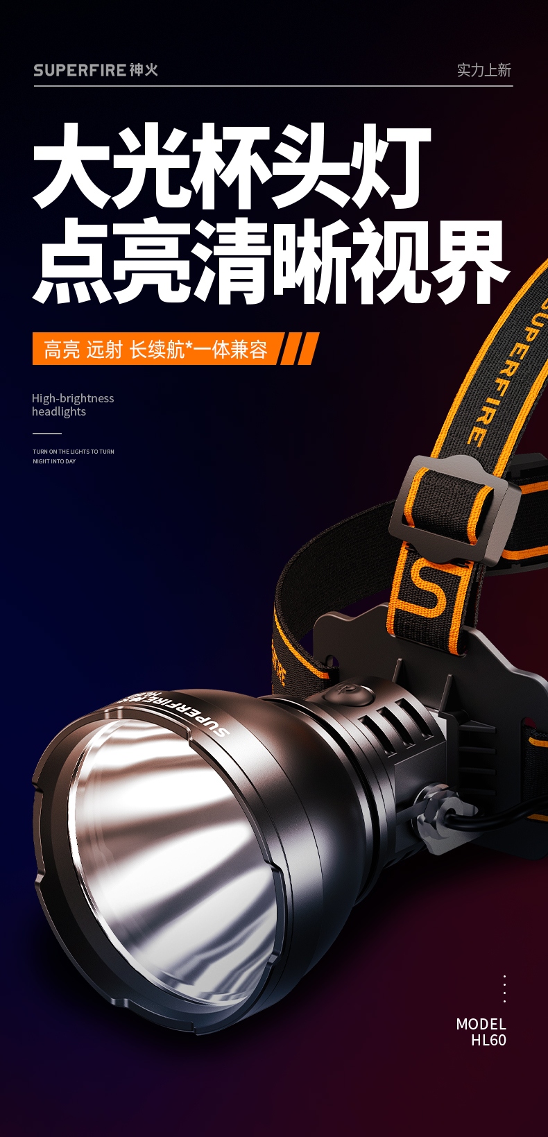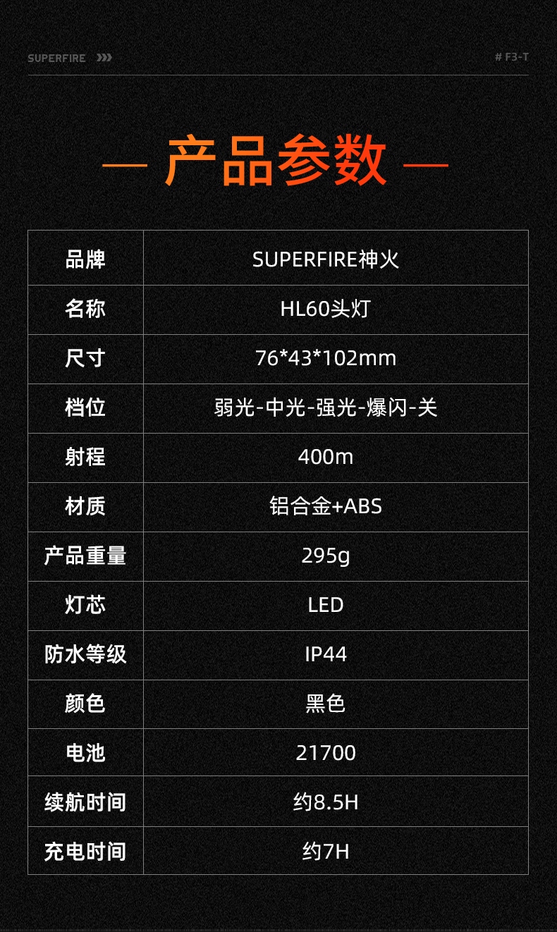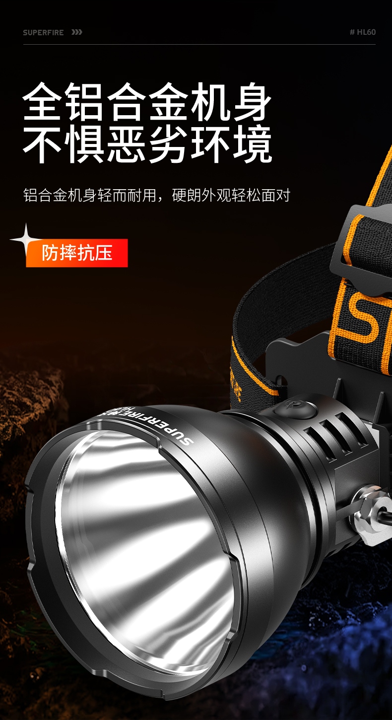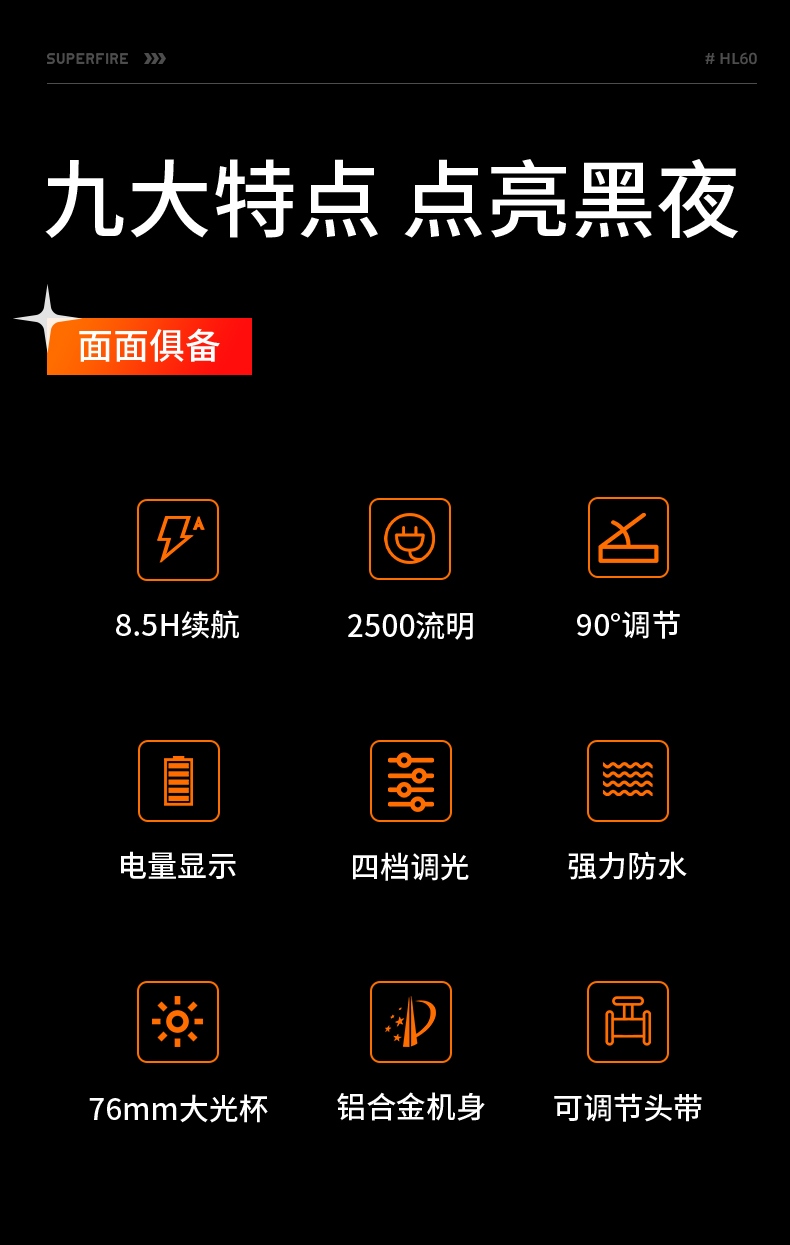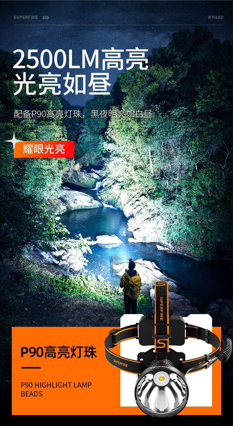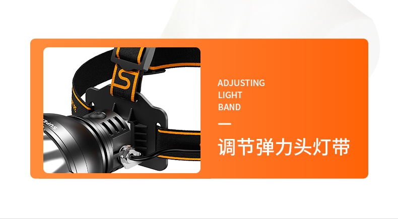 强光亮度,运动头灯,前后均衡设计,轻便不压头,可调节式头灯带,佩戴方便舒适,伸缩调焦,光照范围大,照射距离远,头灯角度调节,超90度角度随意调节,适宜各种环境使用