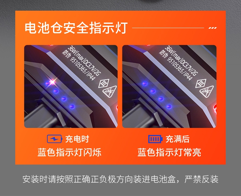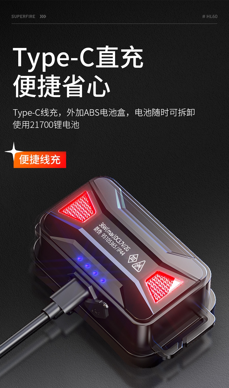 1、四档一体:弱中强、爆闪自由切换 2、头灯角度调节:超90°角度随意调节,适宜各环境使用 3、Type-c充电+可拆卸电池:使用便捷,续航持久 4、电量显示:实时电显,轻松掌握电量,一目了然 5、电池仓特设安全指示灯。