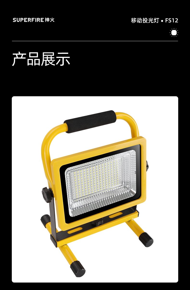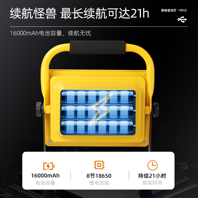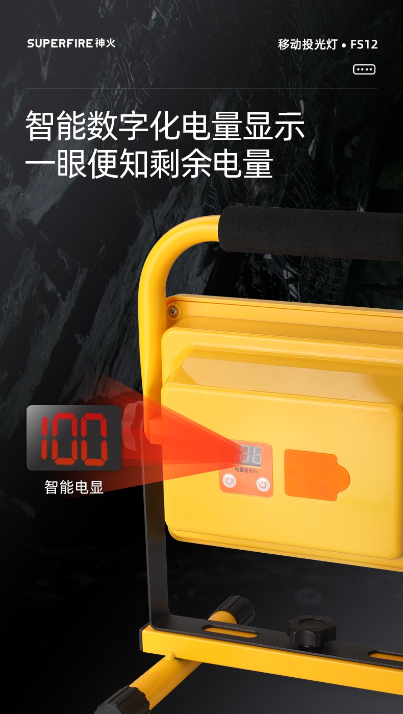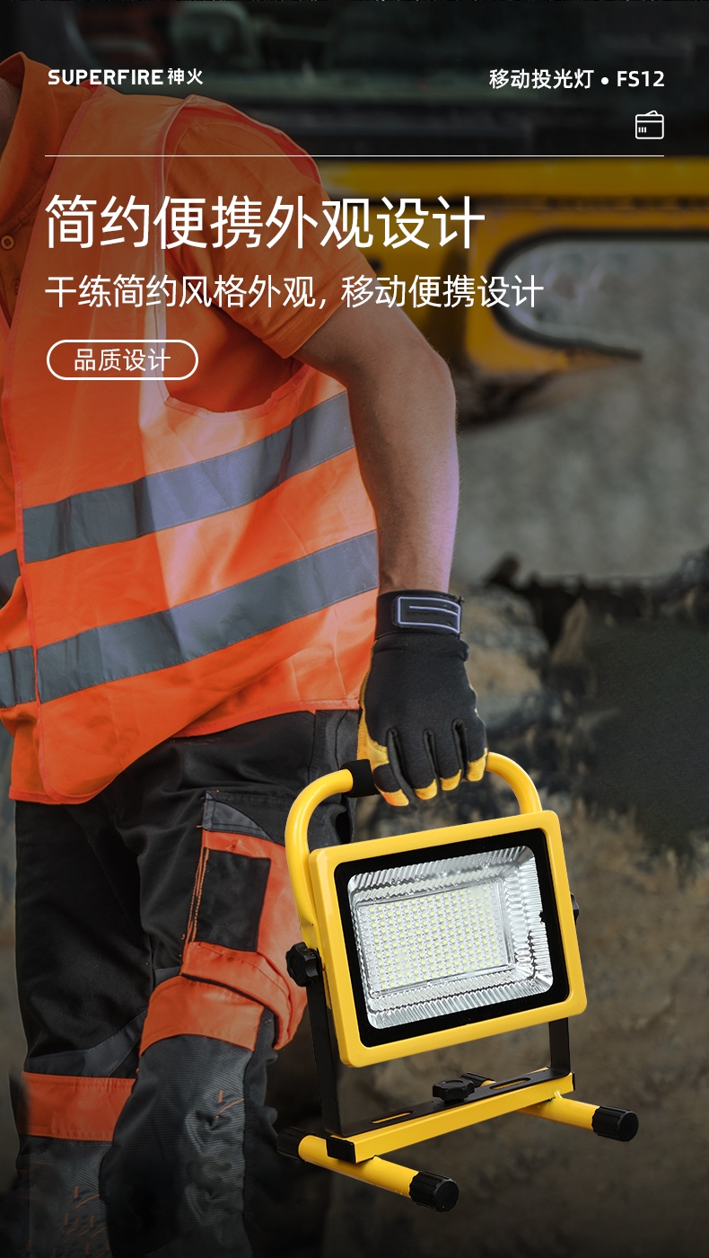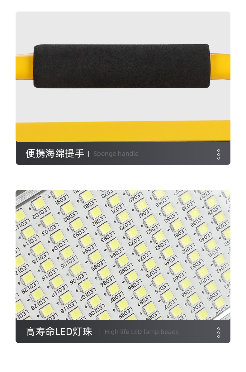 1、多档调光,可满足不同使用场景下的照明需求; 2、含提手,握感更舒适。携带更简单; 3、新型高亮远射灯珠,60W大功率,亮度高,照明效果好。
