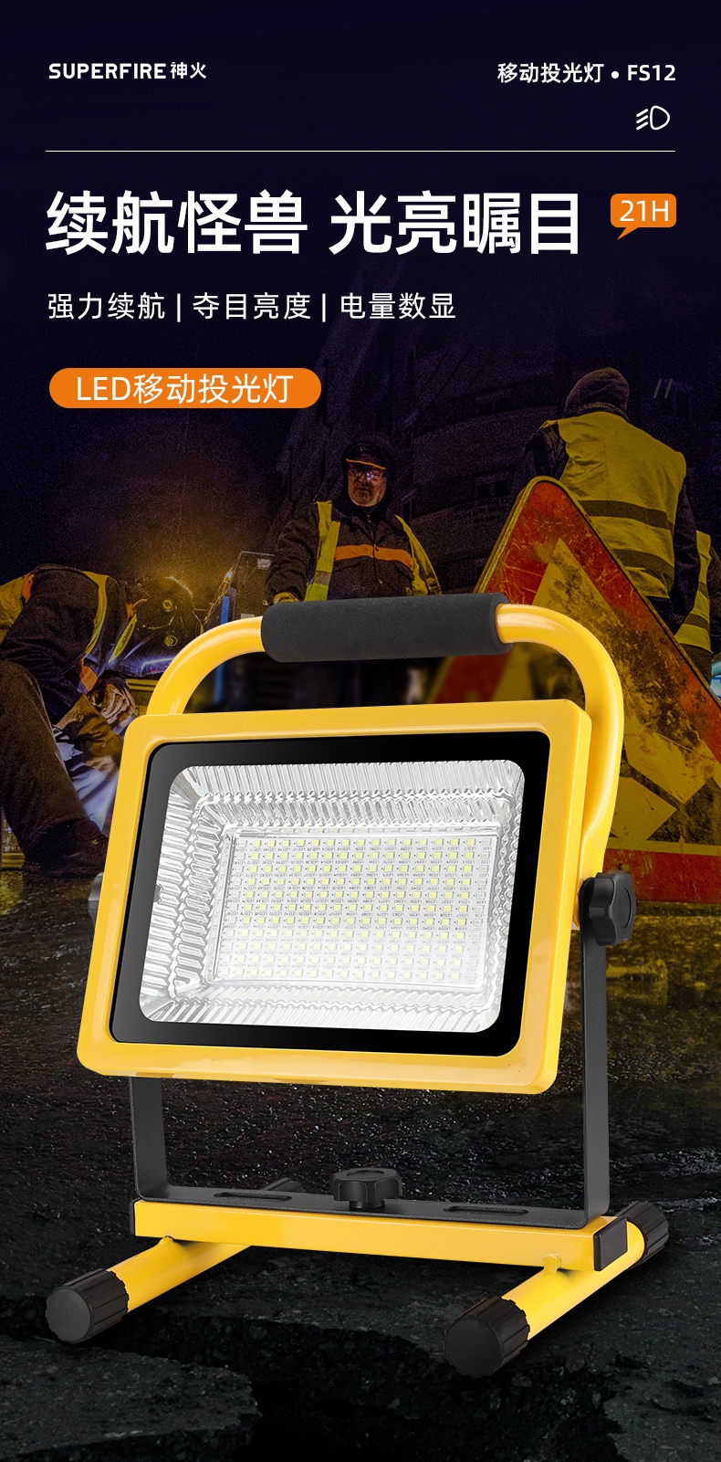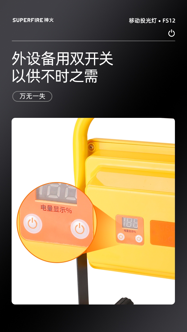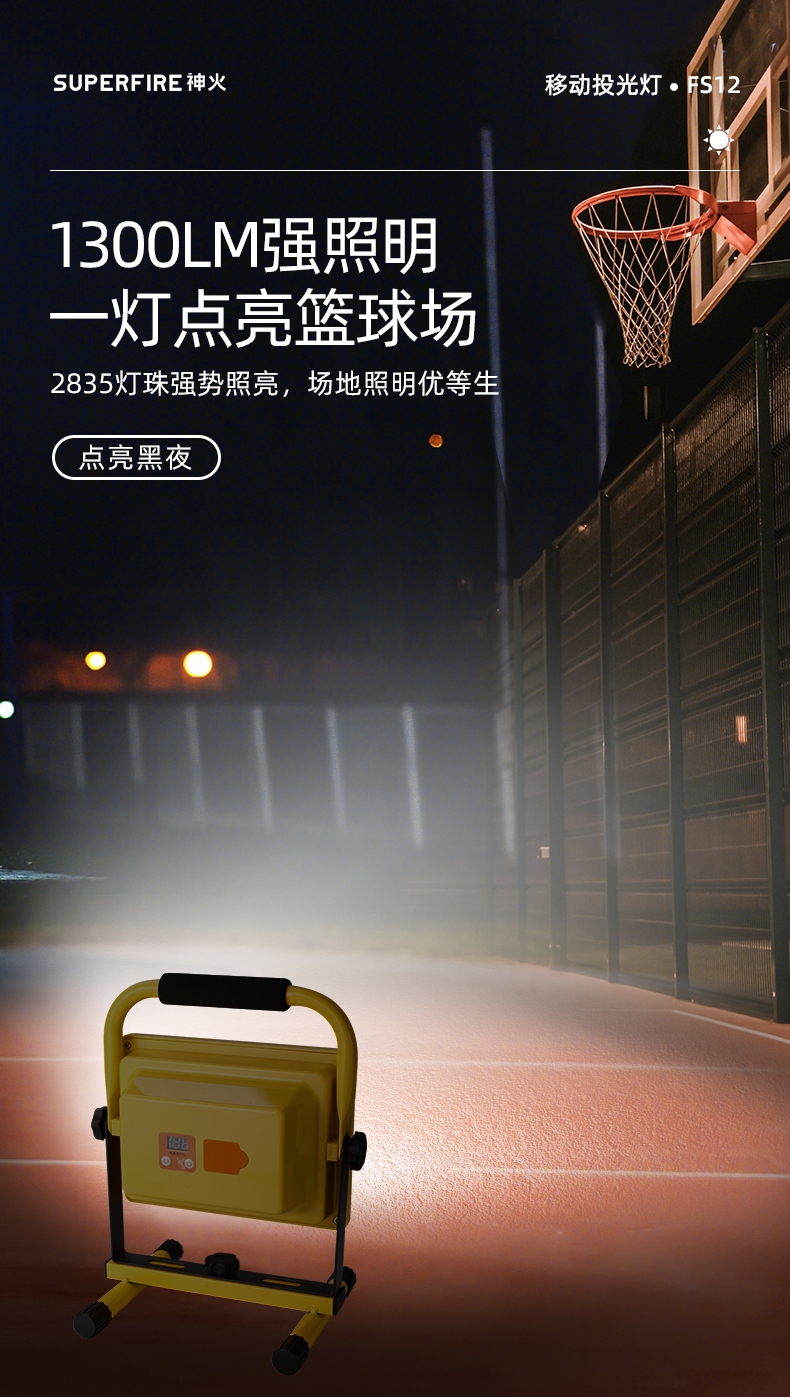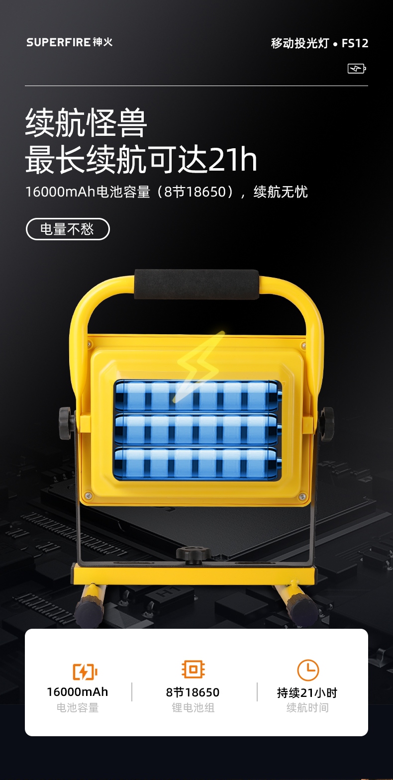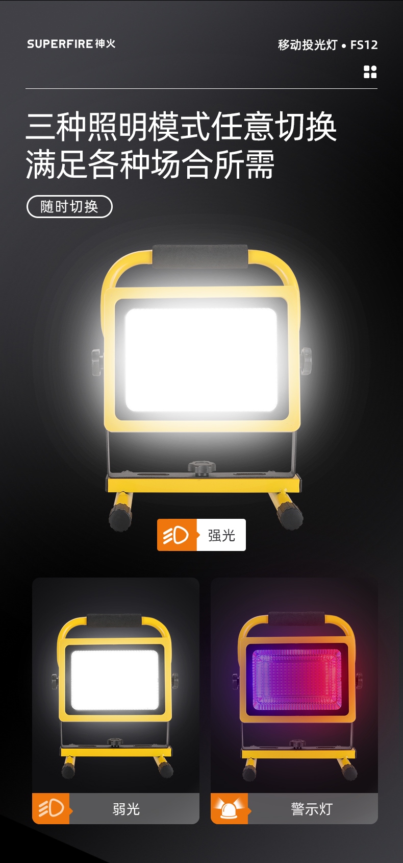 1、多档调光,可满足不同使用场景下的照明需求; 2、含提手,握感更舒适。携带更简单; 3、新型高亮远射灯珠,60W大功率,亮度高,照明效果好。