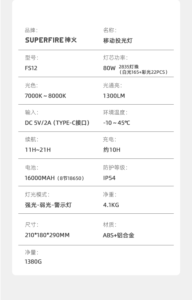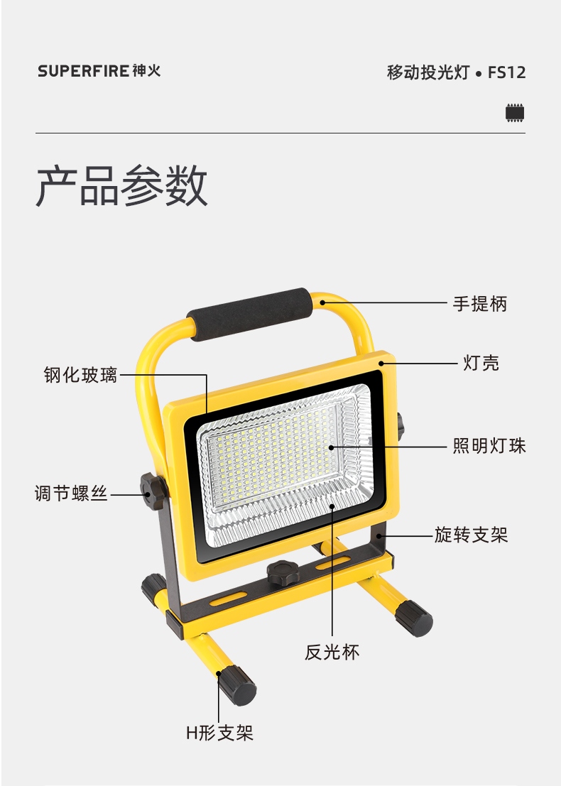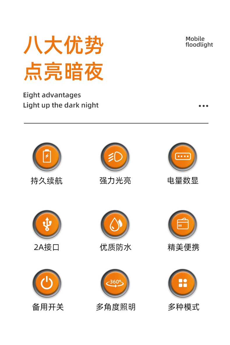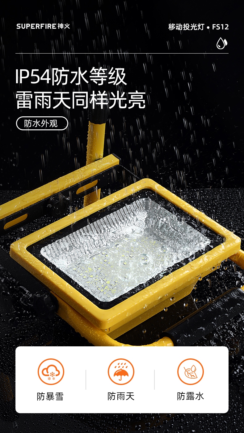 照明角度随心调,照亮每个角落。 IP54防水等级,雷雨天同样光亮。 简约便携外观风格,移动便携设计。