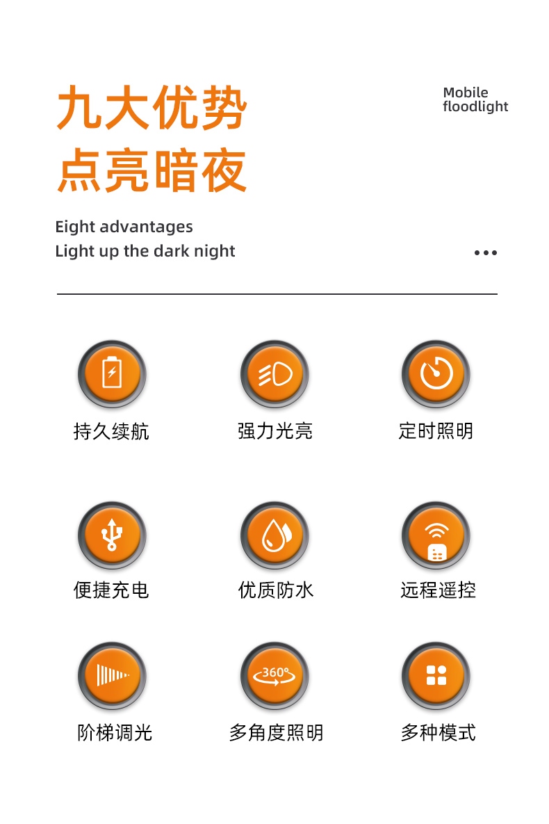 1、多档调光,可满足不同使用场景下的照明需求; 2、含提手,握感更舒适。携带更简单; 3、新型高亮远射灯珠,60W大功率,亮度高,照明效果好。