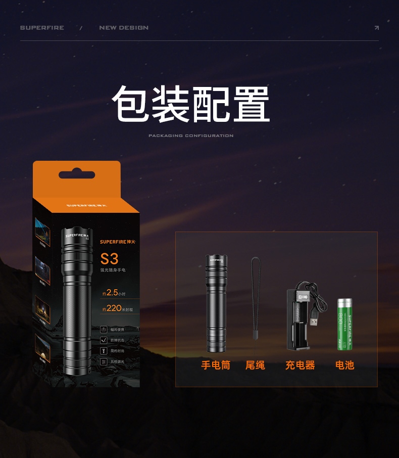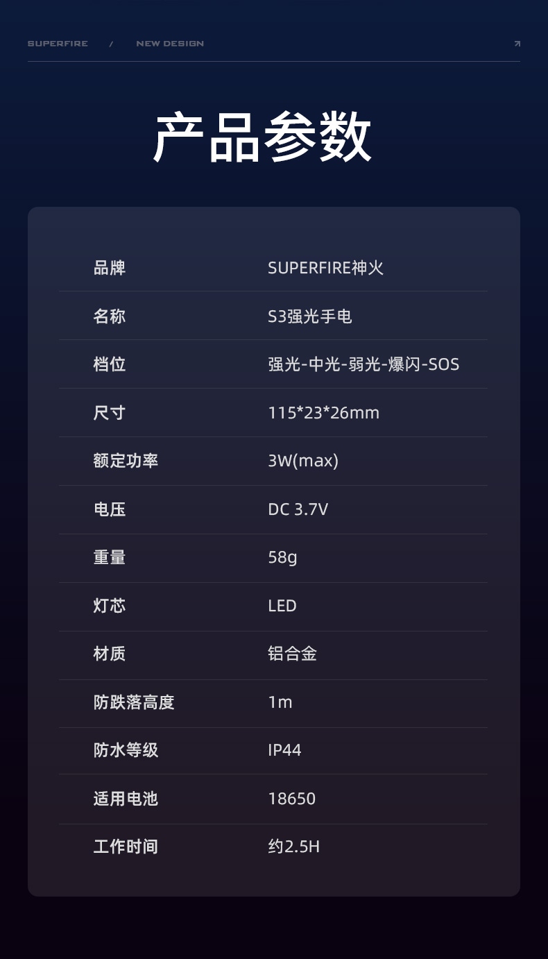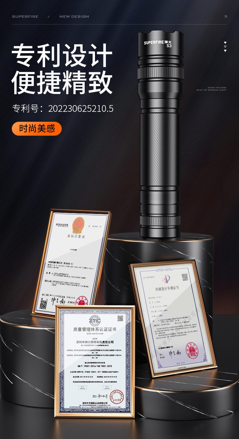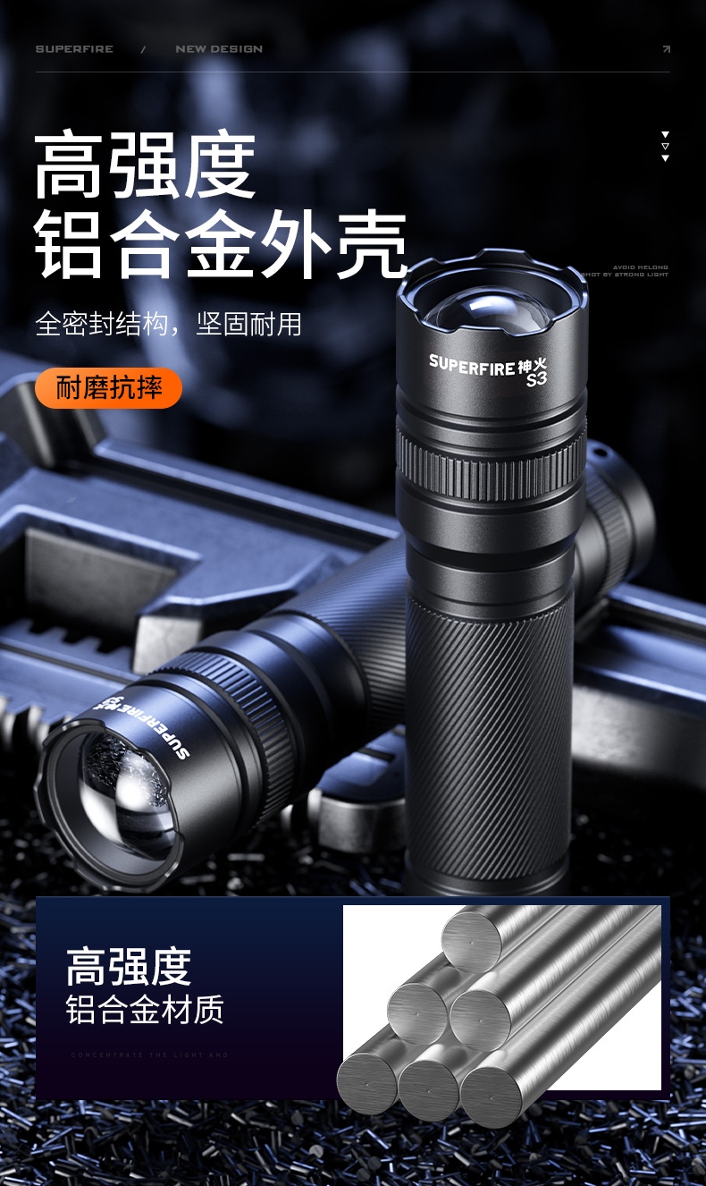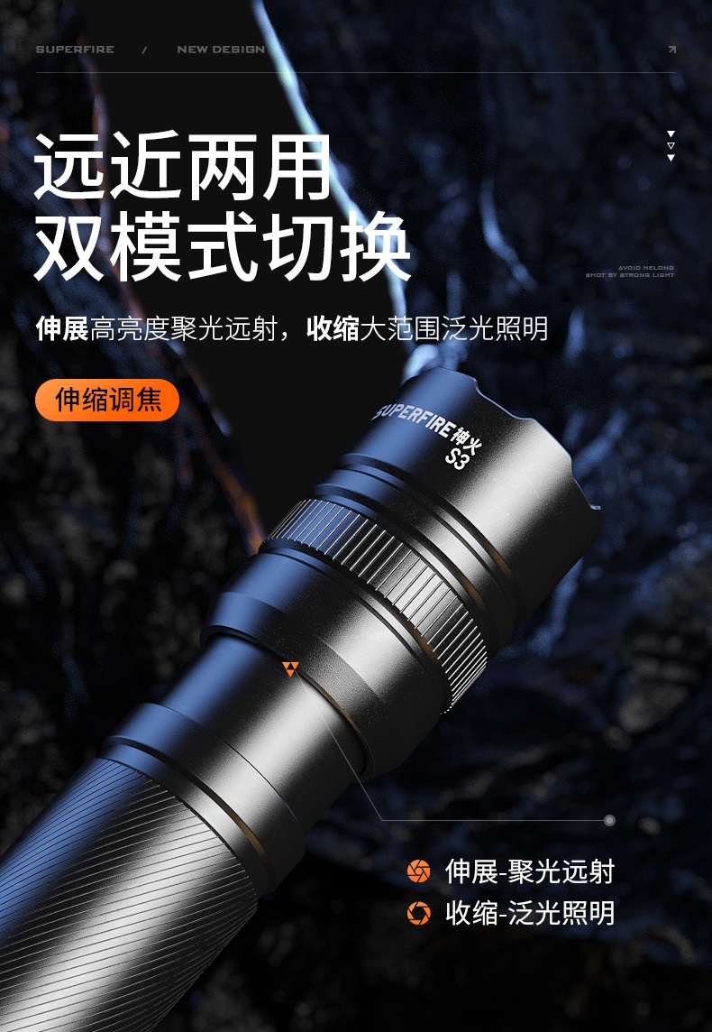 1、多档调光、可满足不同场景下的使用需求 2、专利外观,时尚精致,小巧便携。 3、伸缩调焦、聚泛随心。 4、铝合金筒身、防摔抗击