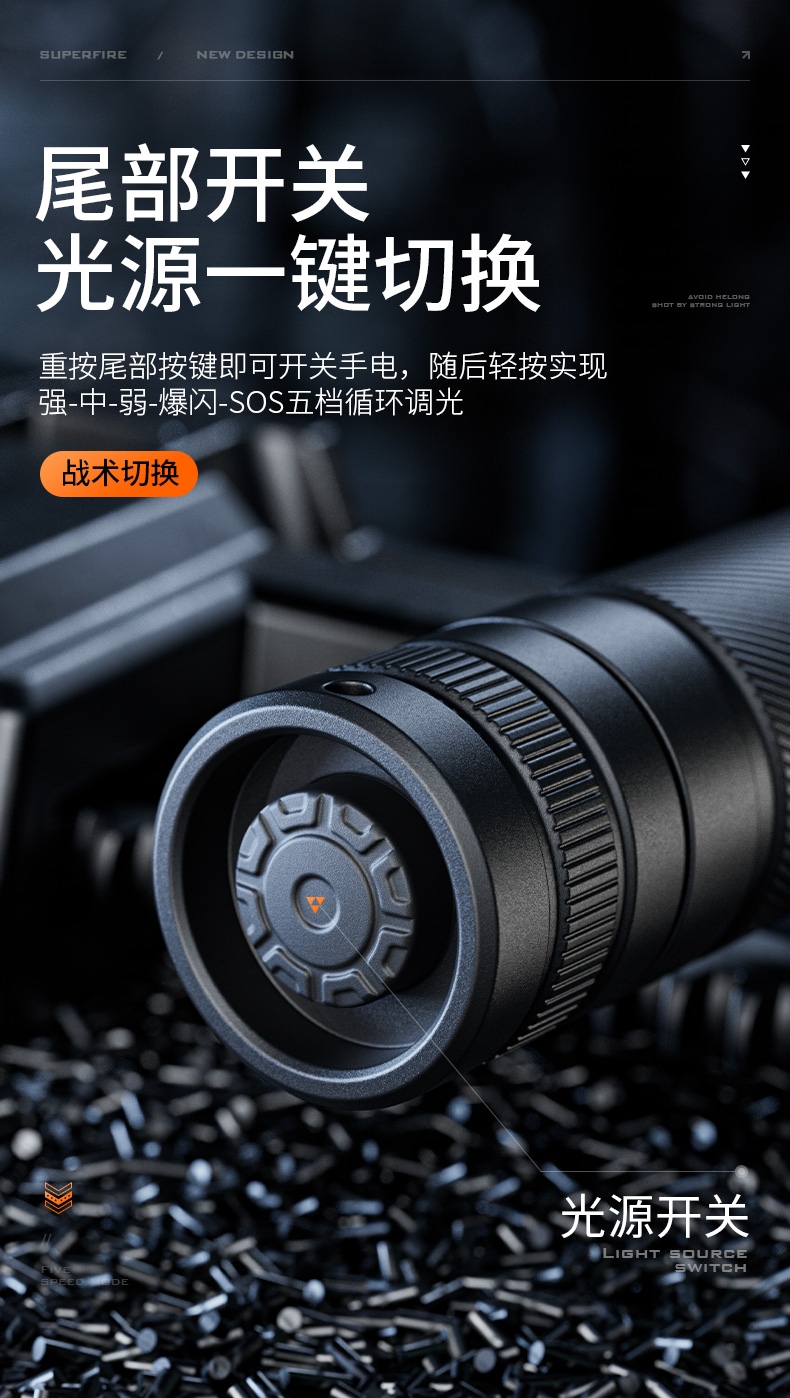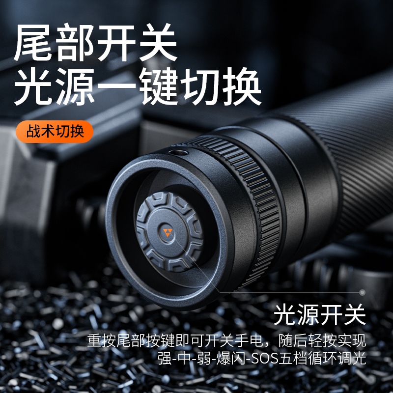 1、千米远射,射程更远,光斑更聚焦。 2、进口灯珠,亮度高,照明效果更好。 3、前后双按键,光源一键点亮,高亮瞬间开启。