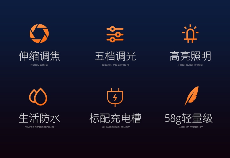 强光亮度,运动头灯,前后均衡设计,轻便不压头,可调节式头灯带,佩戴方便舒适,伸缩调焦,光照范围大,照射距离远,头灯角度调节,超90度角度随意调节,适宜各种环境使用