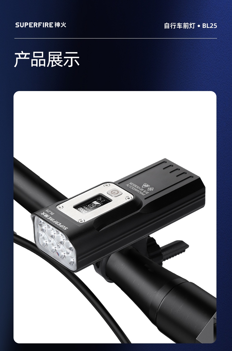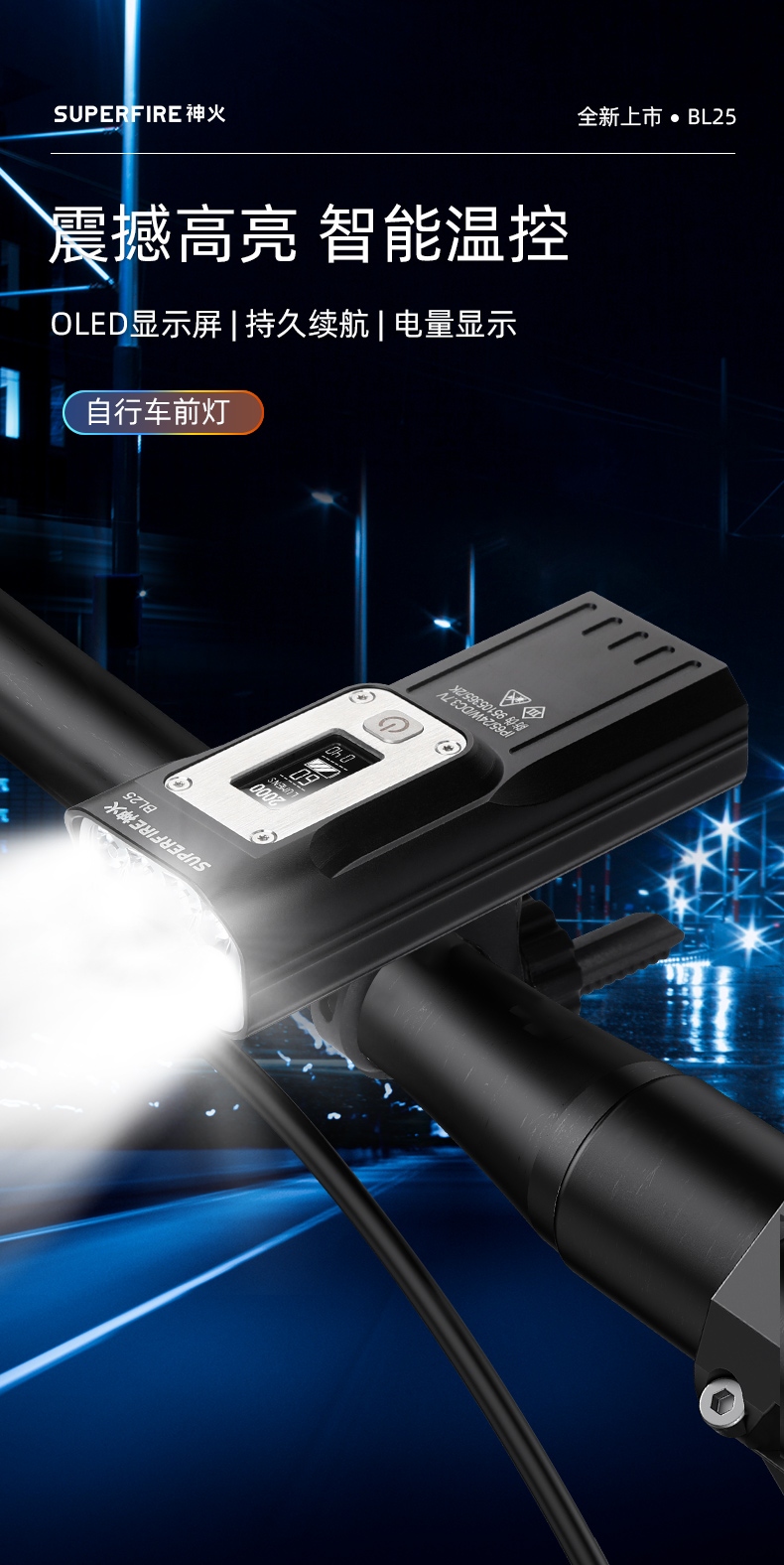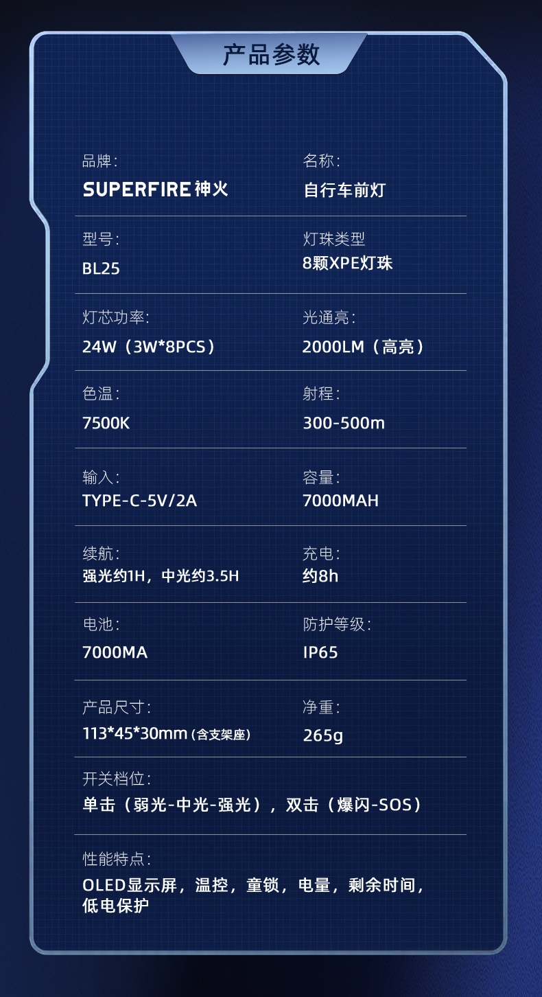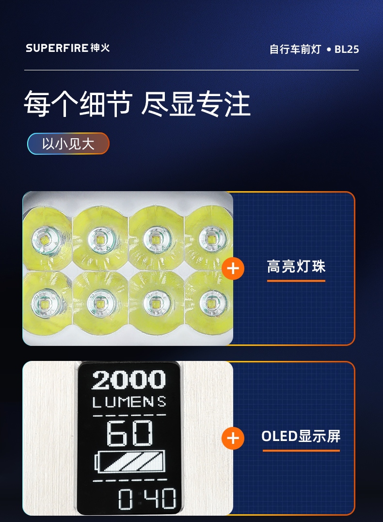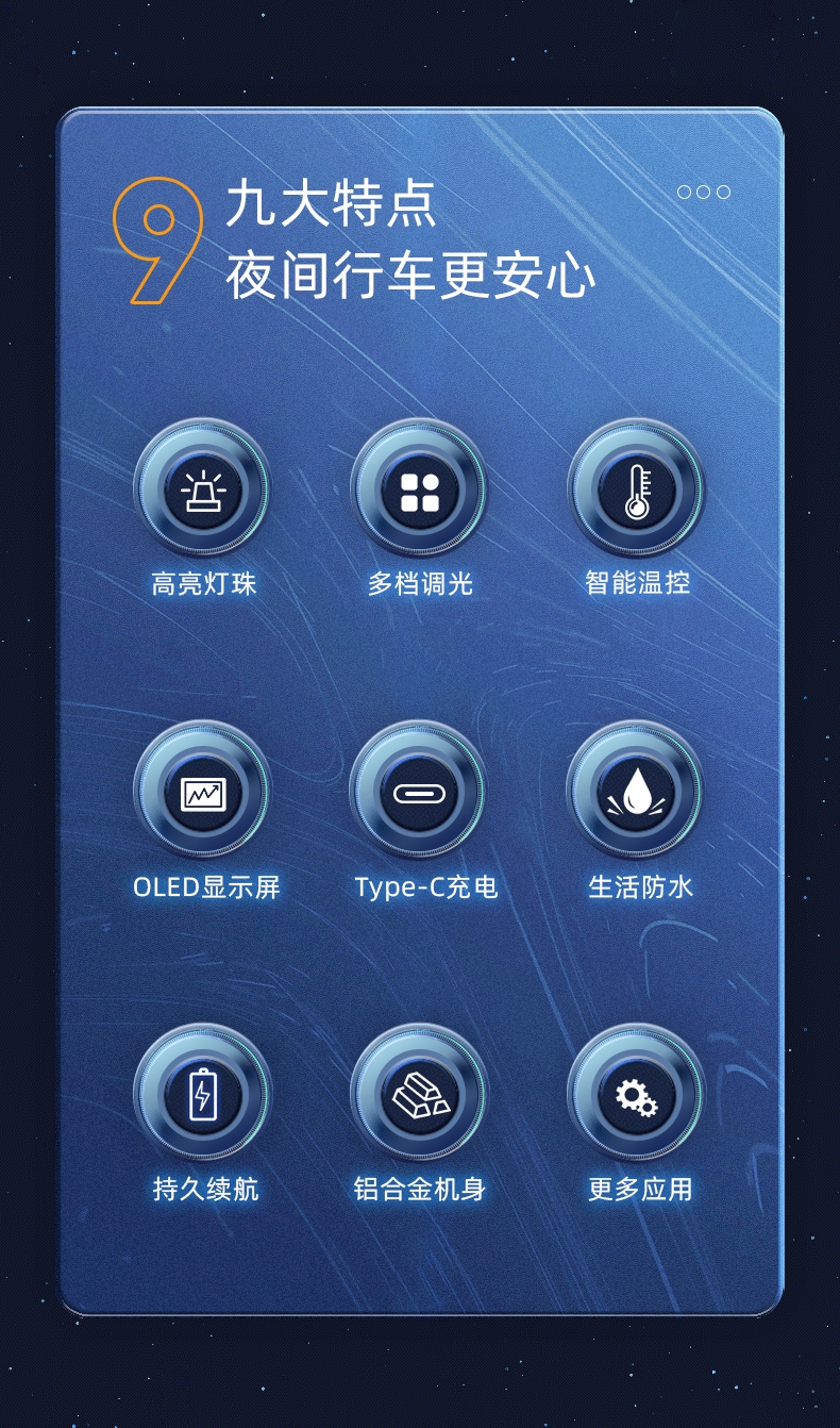 九大特点 夜间行车更安心 高亮灯珠 多档调光 智能温控 OLED显示屏 Type-C充电 持久续航 铝合金机身 生活防水