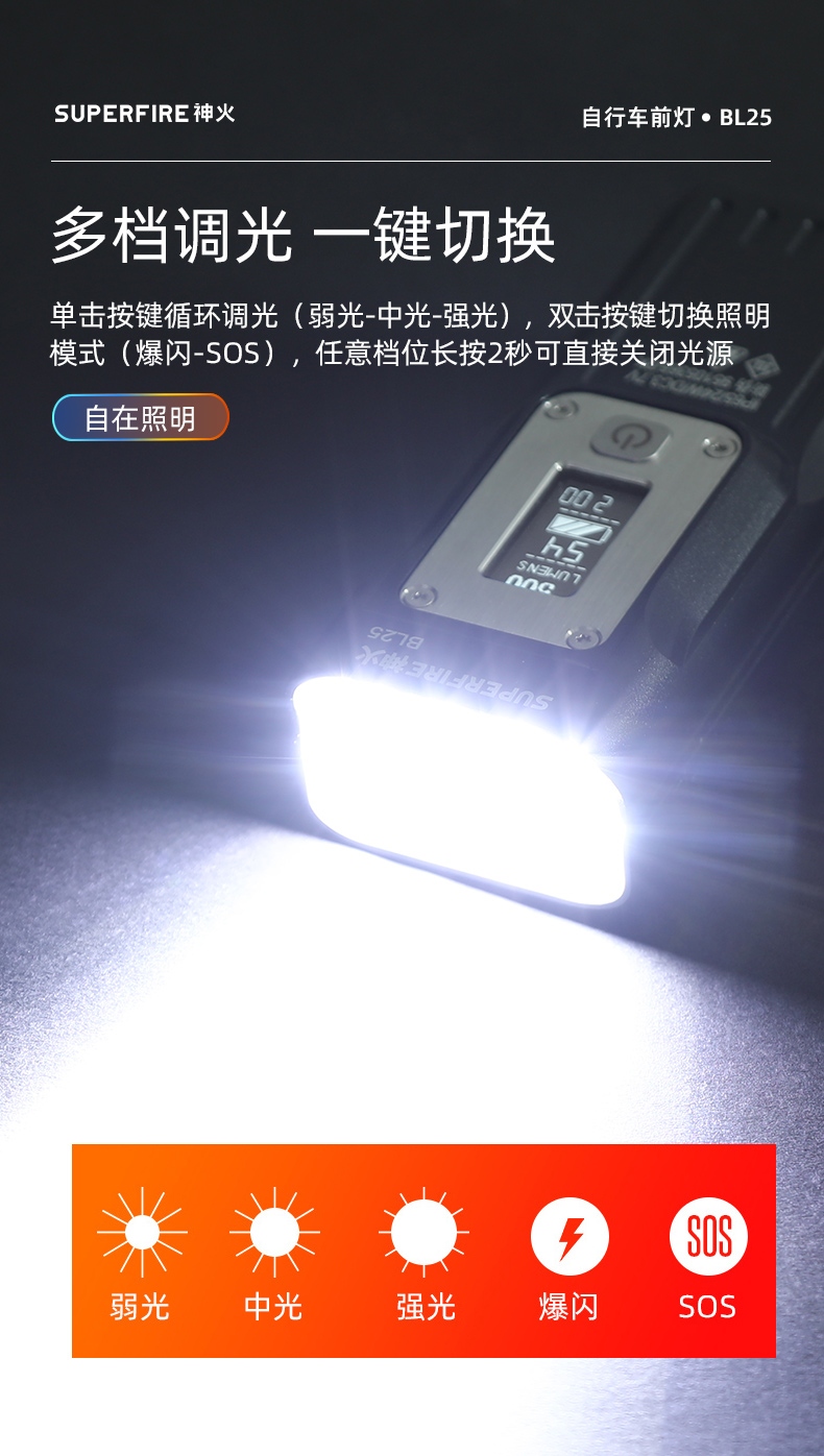 聚光主灯 亮度随心 轻按后端开关按钮,主灯强光点亮,续按依次切换主灯工作光-爆闪光。主灯开启状态下长按5秒,可实现光源色温转换。主灯关闭状态下长按5秒,可开启灯具最亮照明模式。 爆亮强光 亮如白昼 1500LM大功率高亮光源,点亮顷刻如白昼