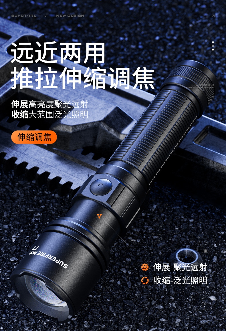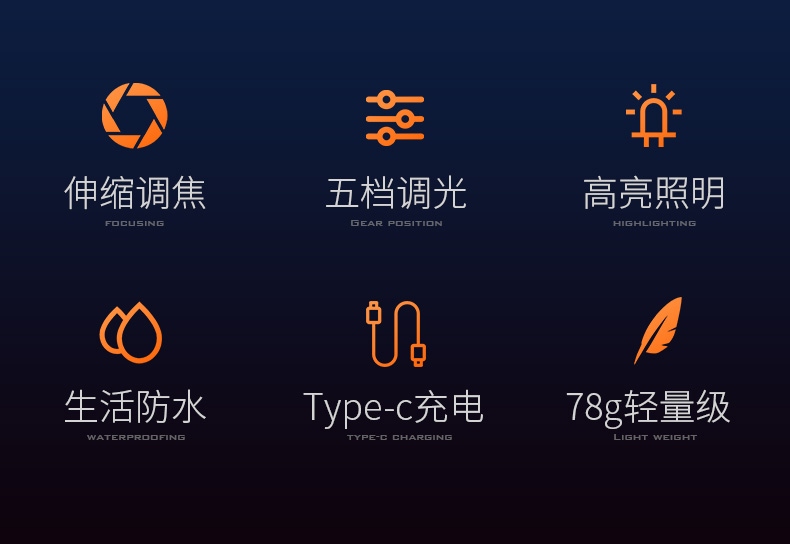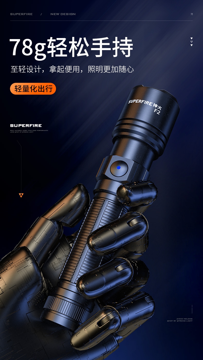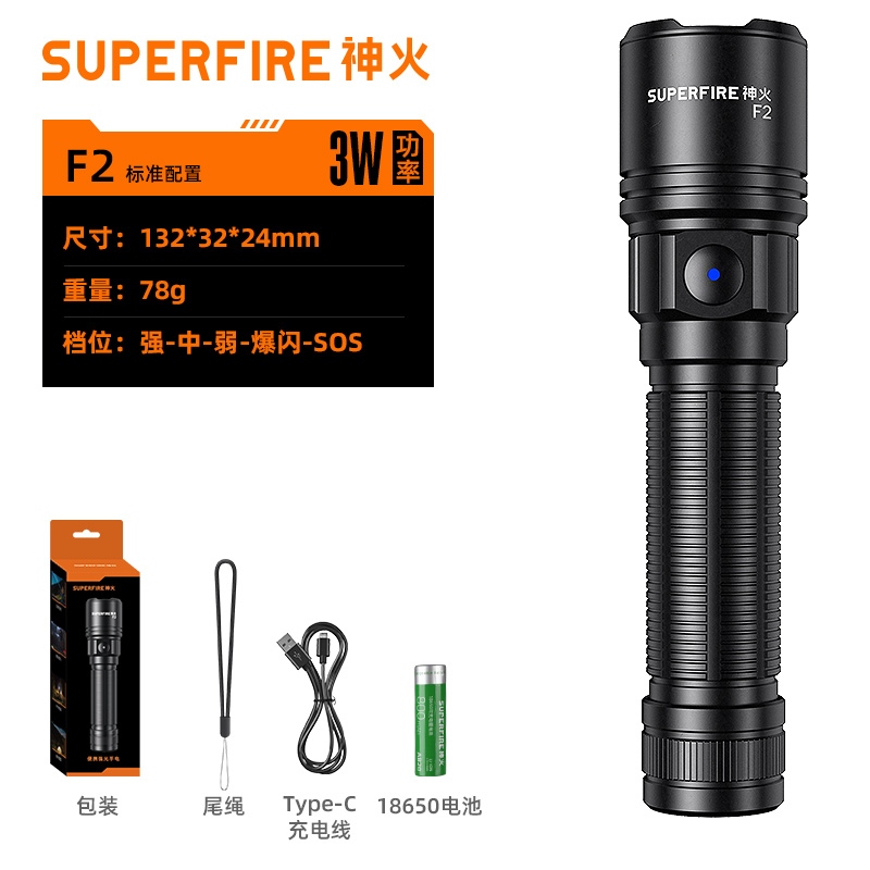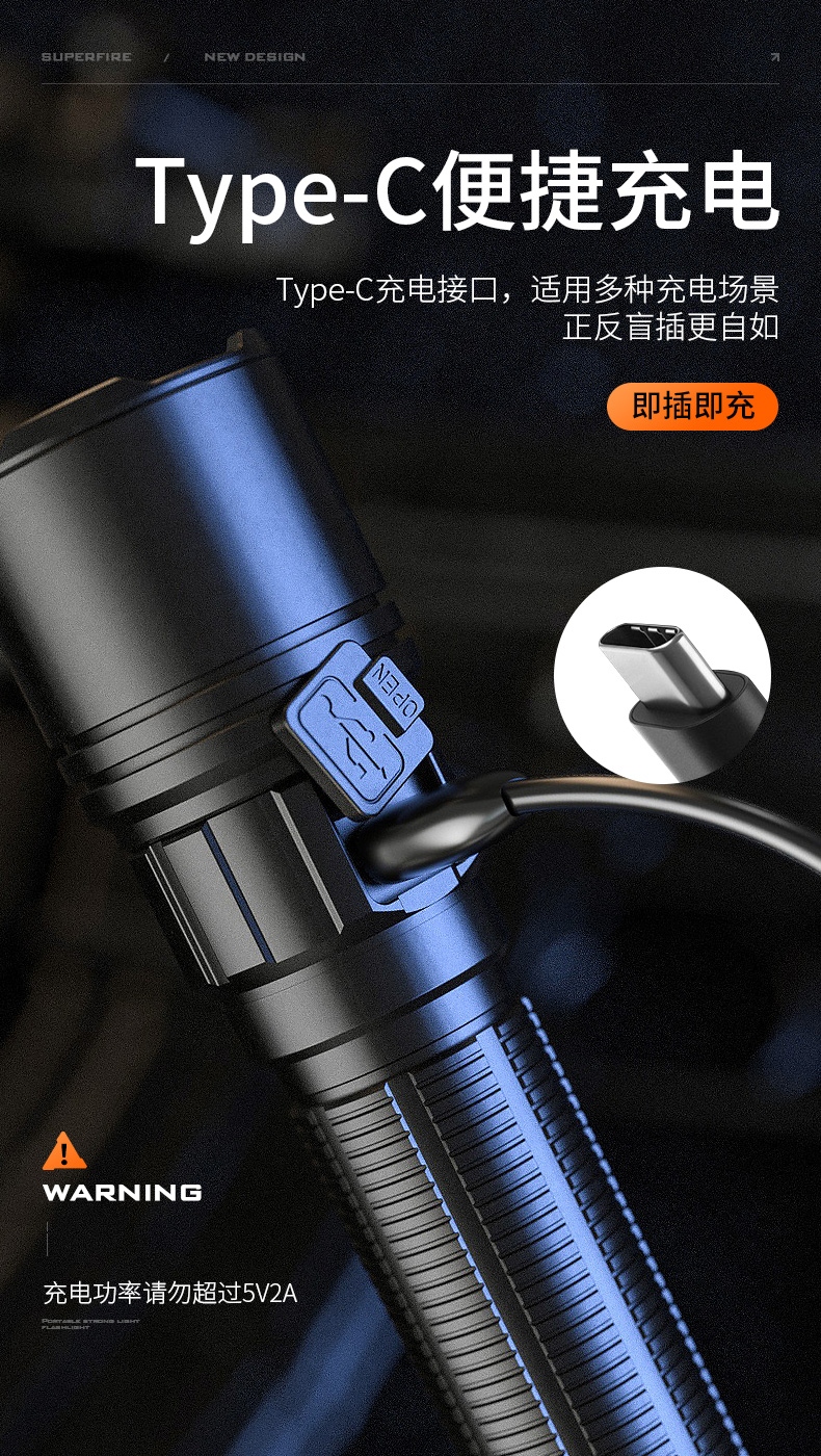 1、Type-c充电,兼容市面通用充电线,可正反盲插。 2、多重安全程序,有效延长使用寿命及时间。 3、最高220Lm亮度,最远330m 射程,小身材大能量。