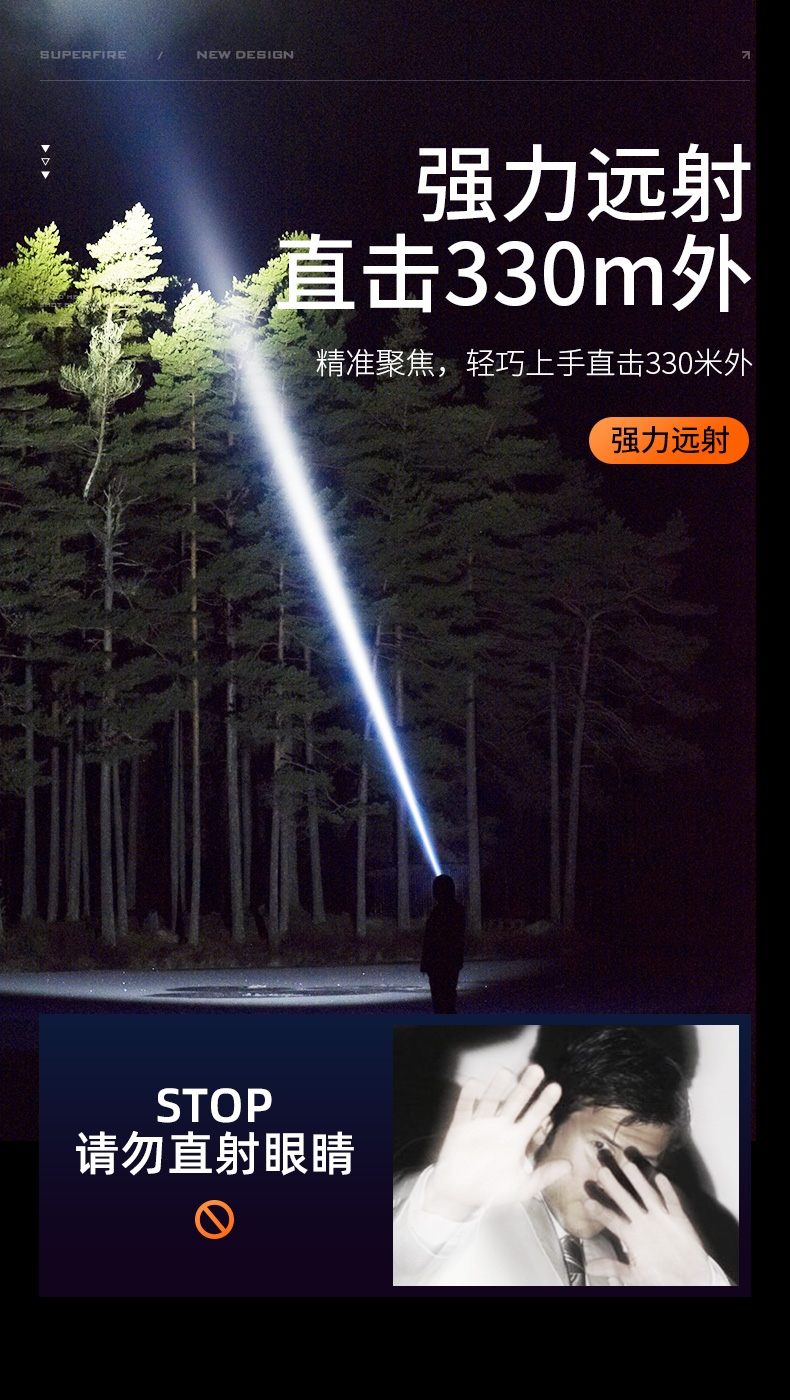 1、千米远射,射程更远,光斑更聚焦。 2、进口灯珠,亮度高,照明效果更好。 3、前后双按键,光源一键点亮,高亮瞬间开启。