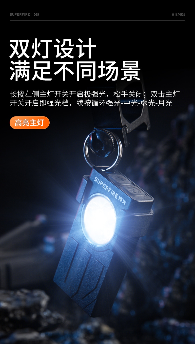 聚光主灯 亮度随心 轻按后端开关按钮,主灯强光点亮,续按依次切换主灯工作光-爆闪光。主灯开启状态下长按5秒,可实现光源色温转换。主灯关闭状态下长按5秒,可开启灯具最亮照明模式。 爆亮强光 亮如白昼 1500LM大功率高亮光源,点亮顷刻如白昼