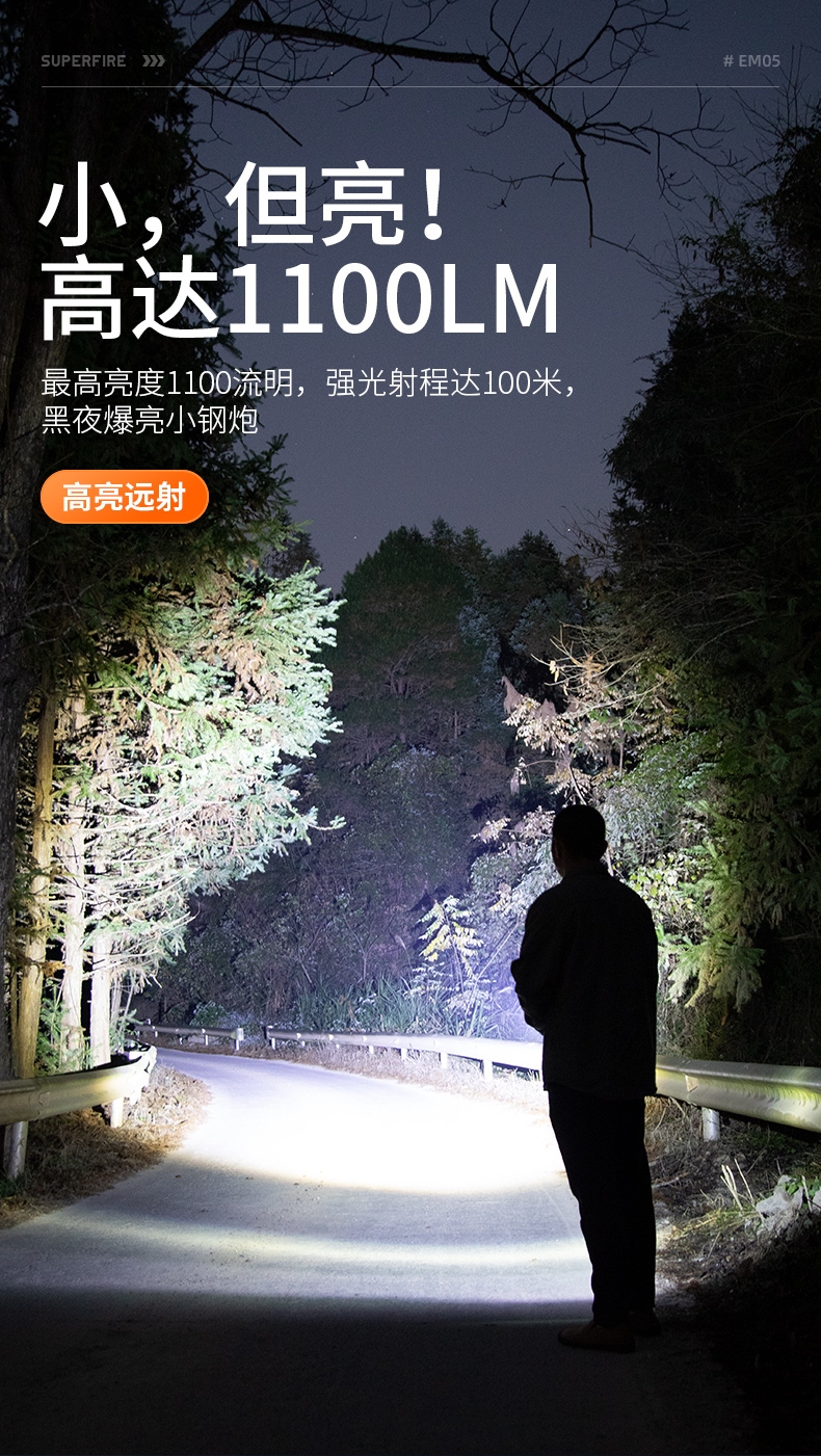 1、千米远射,射程更远,光斑更聚焦。 2、进口灯珠,亮度高,照明效果更好。 3、前后双按键,光源一键点亮,高亮瞬间开启。