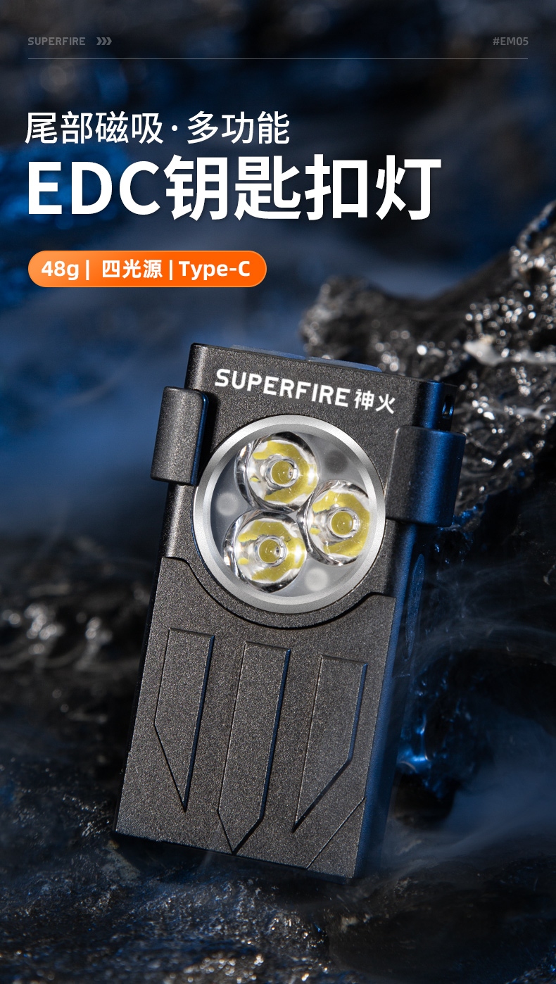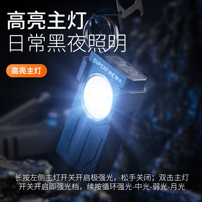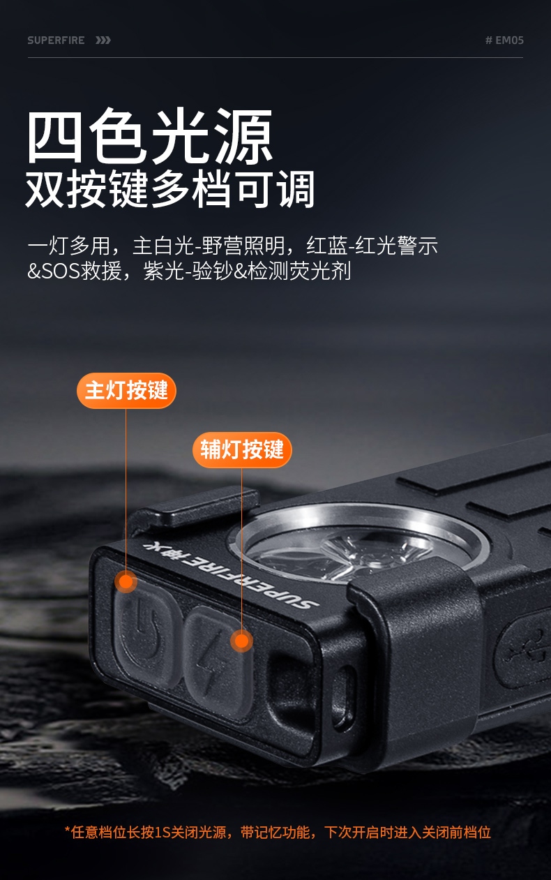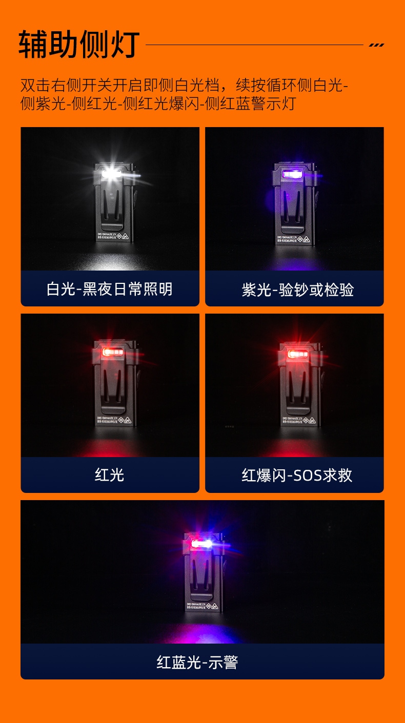 1.多种照明模式(远射照明,红光SOS求救和UV紫光) 2.尾部磁吸功能,便于释放双手,检测或充当临时应急灯 3.双灯头和钥匙扣设计,专业为便携出行设计。